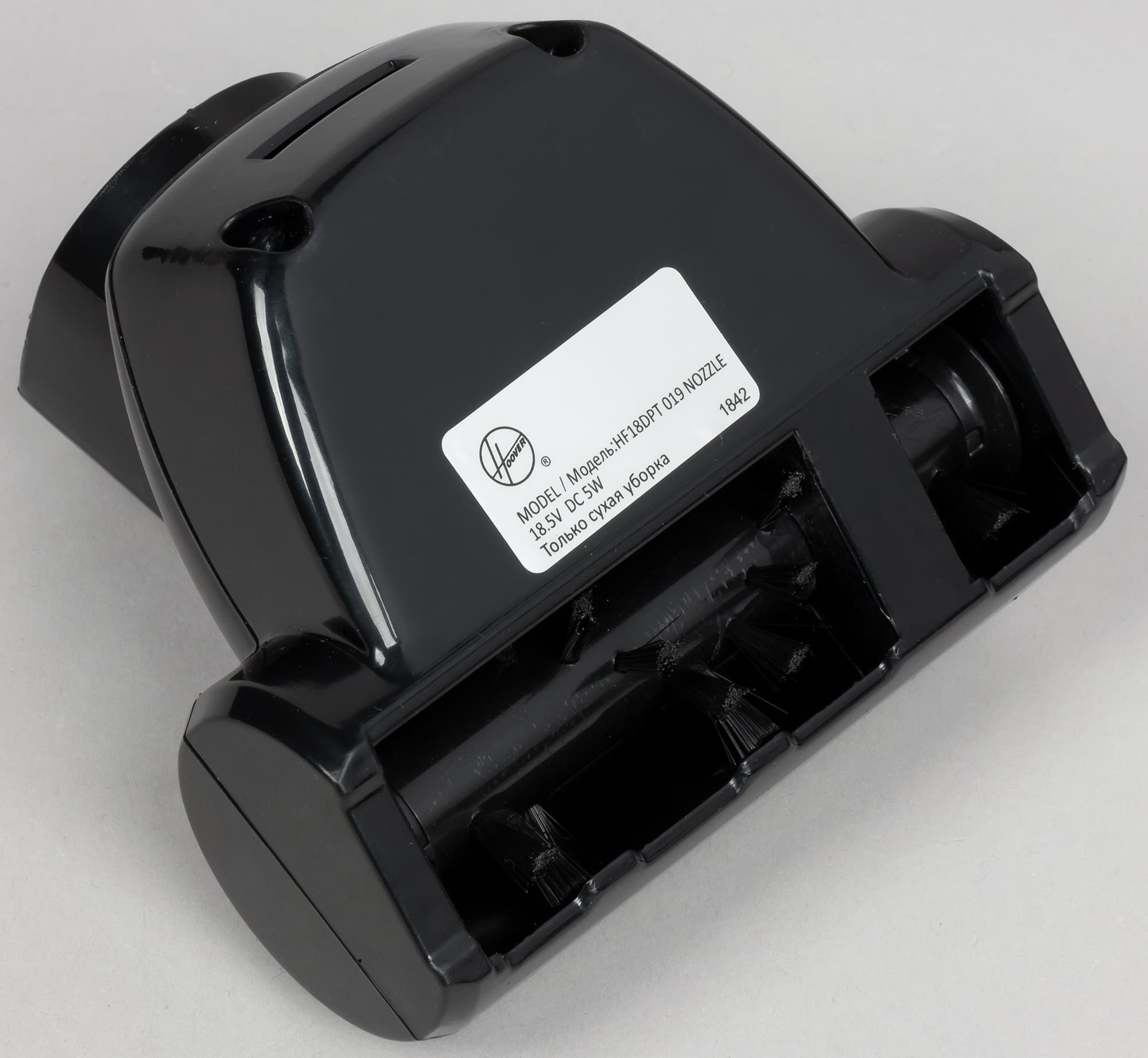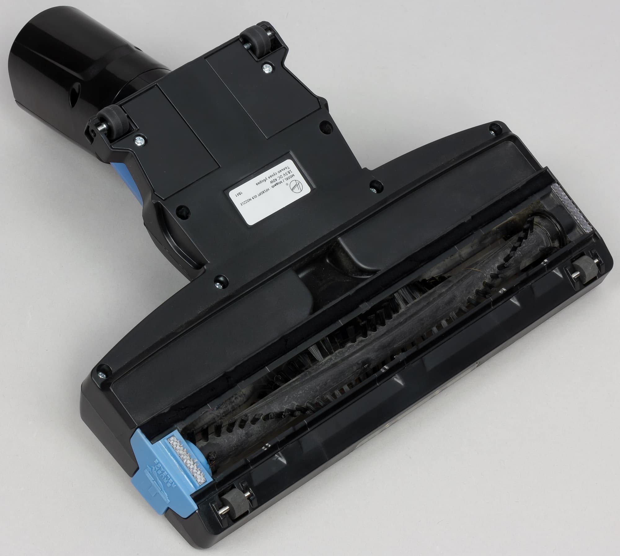 Ширина всей электрощетки 250 мм, вращающейся щетки — 215 мм. Скользить по полу ей помогают четыре жестких пластиковых ролика. Снизу на корпусе щетки спереди есть три выреза для захвата мусора потоком воздуха непосредственно от стен и предметов обстановки. Питание для электромотора и подсветки передается от основного блока по проводникам в трубке, но при необходимости электрощетку можно закрепить непосредственно на основном блоке.