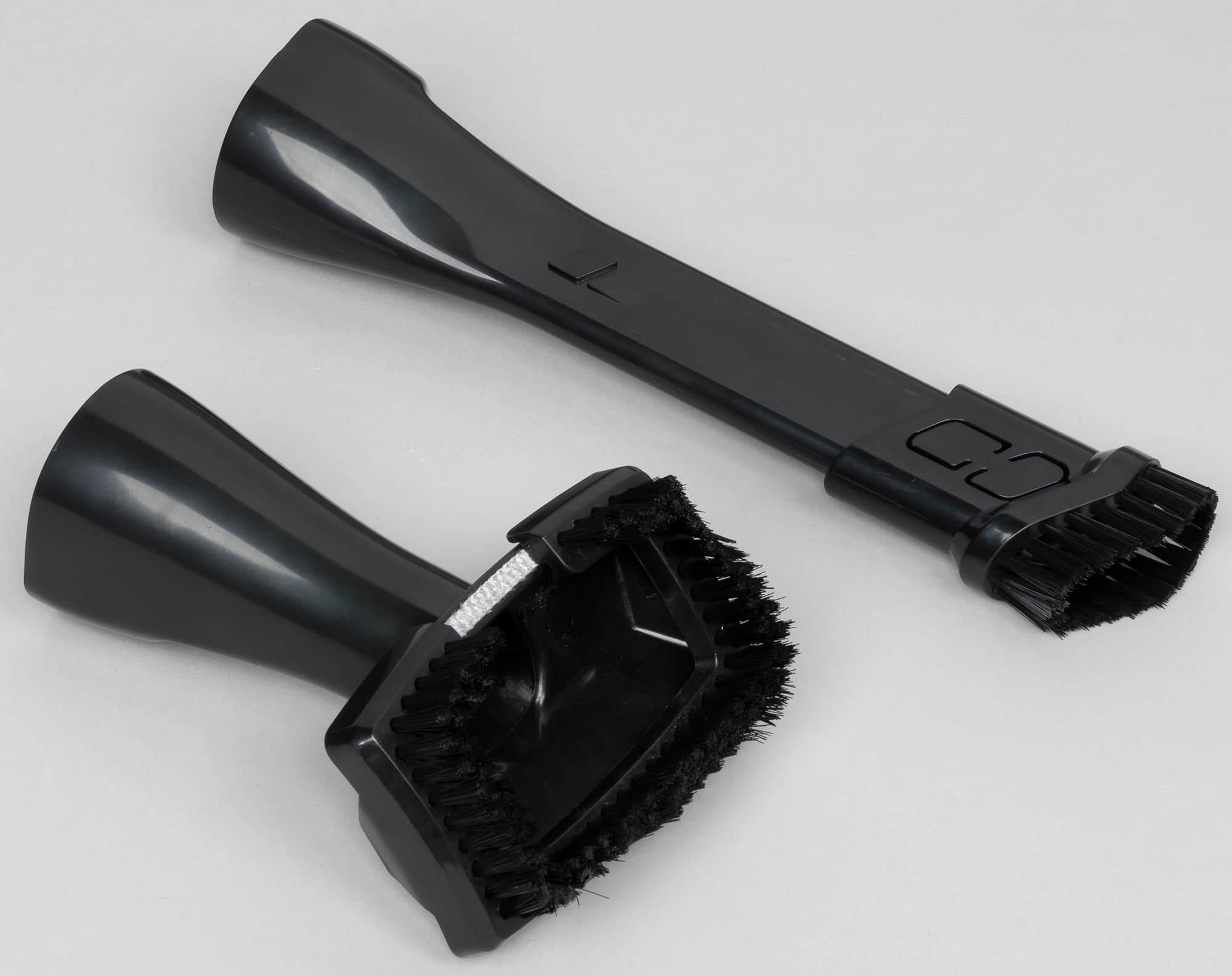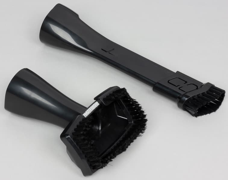 К пылесосу прилагается щелевая насадка традиционной конструкции (ее общая длина 230 мм, узкой части — 150 мм). На насадку можно надеть щеточку. Также прилагается щетка с щетиной средней жесткости (обычно такие называют «мебельными»), щетину с которой тоже можно снять.