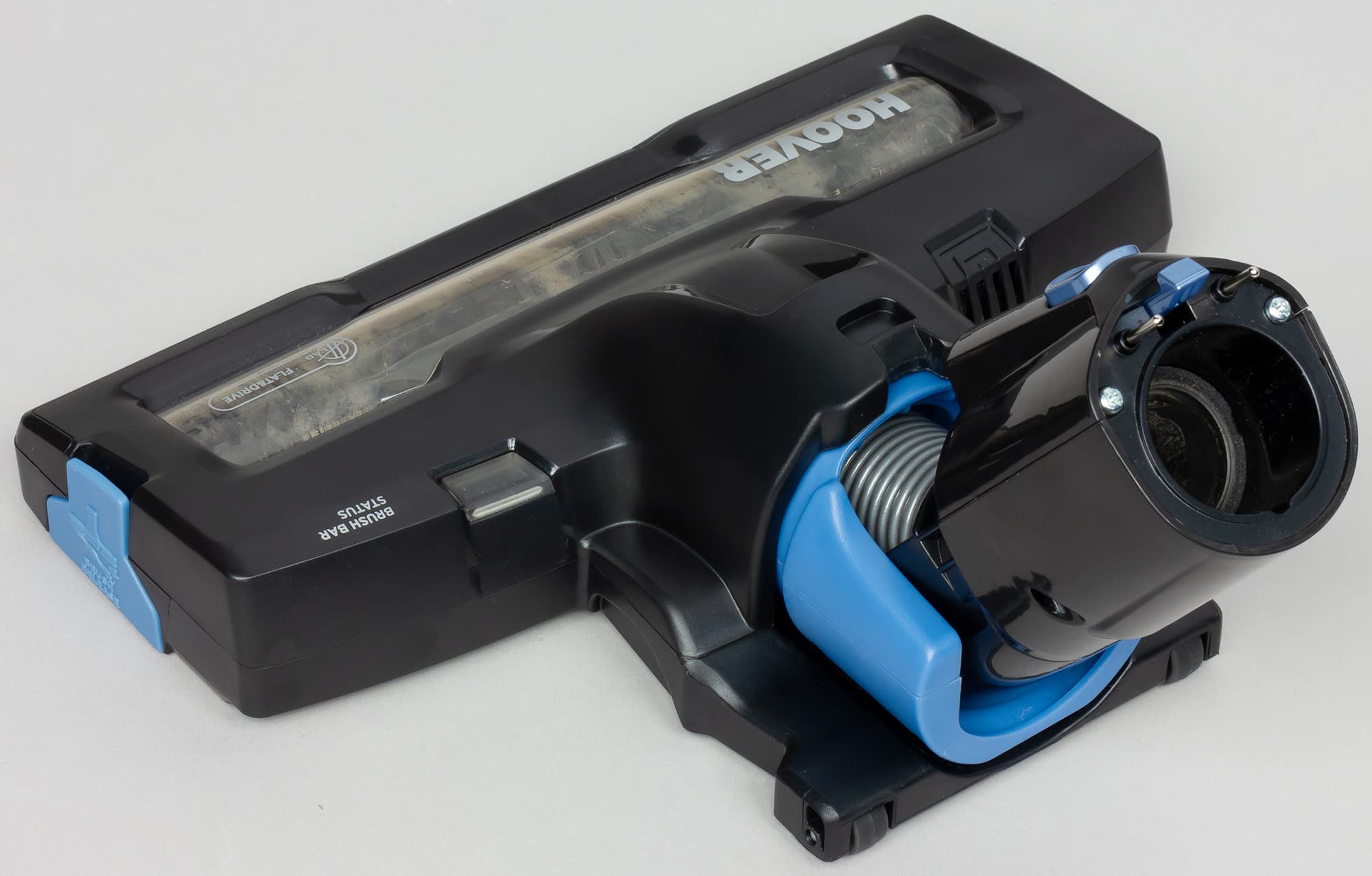 Уход за турбощеткой состоит в извлечении из нее собственно щетки — для этого есть крепление, выделяющееся своим голубым цветом — его нужно потянуть на себя.
