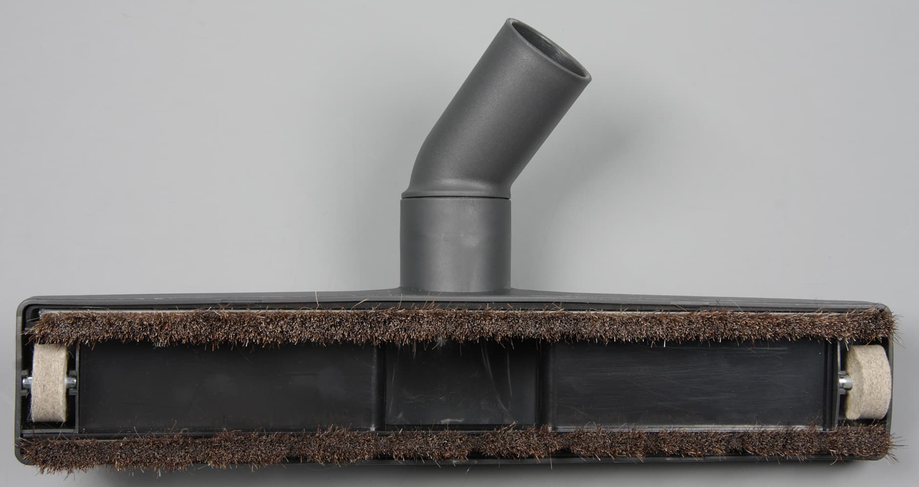 Снизу есть два ряда мягкой щетины, видимо, натуральной. В переднем ряду есть перепускные окна для подбора крупного мусора. Боковые ролики облегчают перемещение насадки по полу и не дают пластиковому корпусу щетки соприкасаться с полом и царапать его. Ролики изготовлены из войлока, что также снижает вероятность оставления царапин на нестойких к повреждениям полах.