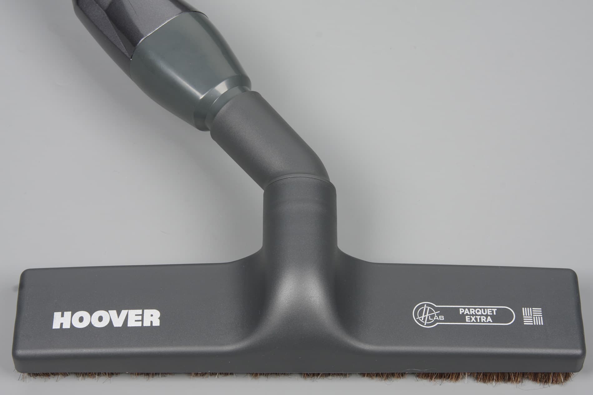 Эта насадка имеет относительно невысокий профиль (ее высота 84 мм). Однако даже в самом нижнем положении патрубка подсоединенная труба отходит чуть вверх относительно нижней плоскости насадки. Поэтому ее не получается далеко подсунуть под протяженные предметы обстановки с небольшим просветом, одновременно обеспечивая хороший прижим к полу. Герметичность подвижного сочленения обеспечивает гибкая гофрированная труба из пластика с каркасом из стальной пружины. Вращающаяся от электромотора щетка оснащена двумя волнообразными рядами из пучков тонких, но жестких щетинок. На валу щетки есть две продольные канавки, которые облегчают удаление всего намотавшегося на него. При работе прозрачный колпак позволяет определить, вращается ли щетка, а в перерывах видно, сколько и чего на щетку намоталось и не пора ли ее почистить.