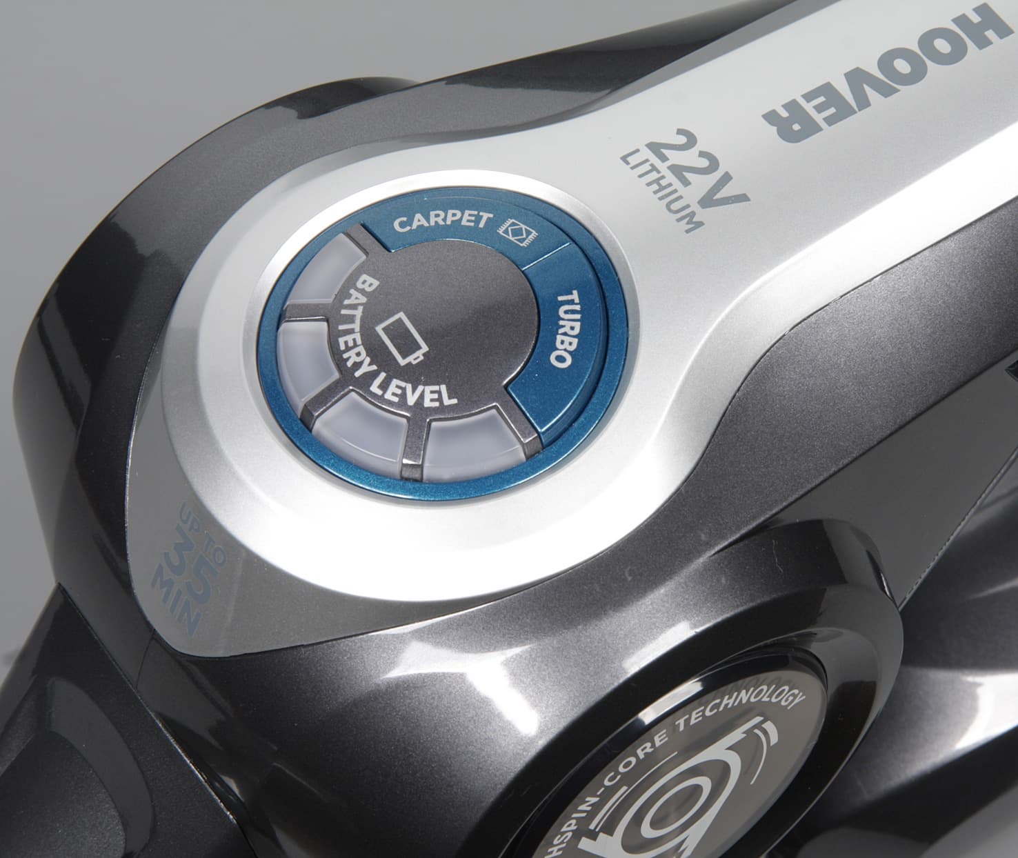 Управляется пылесос кнопкой на рукоятке и двумя кнопками сверху. Кнопка на рукоятке нажата — мотор крутится, не нажата — не крутится. Рычажок рядом позволяет зафиксировать кнопку в нажатом состоянии. Кнопка Carpet включает/выключает мотор электрощетки и подсветку. Зачем это нужно не очень понятно, так как нет смысла использовать насадку с электрощеткой, когда она не вращается. Кнопкой Turbo можно включить/выключить режим высокой мощности всасывающего вентилятора. Неудобно то, что нет индикатора того, что пылесос в данный момент работает на высокой мощности.