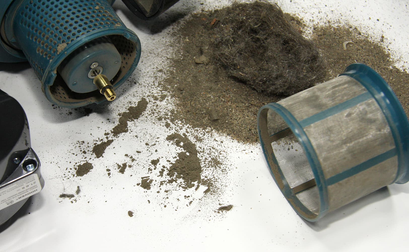 Вращение сетки явно способствовало тому, что мусор сваливался вниз, а не налипал на сетку, как это обычно бывает у пылесосов с традиционным циклонным фильтром. Постмоторный фильтр задержал много пыли и мелких волокон. Видно, что часть мелкой пыли все же прошла через фильтр (воздух идет изнутри цилиндра фильтра наружу).