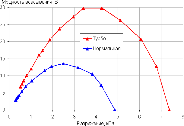 Мощность всасывания (что это такое и как мы ее измеряем, описано в отдельной статье) мы определяли при работе пылесоса без трубы и насадок. Зависимость мощности всасывания от создаваемого разрежения приведена на графике ниже: