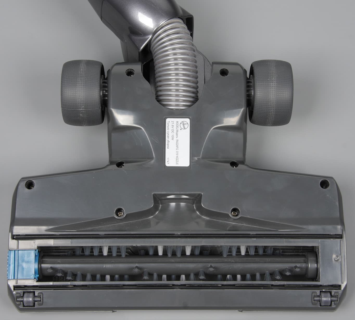Подшипник в торце щетки — это, скорее всего, подшипник скольжения, но достоверно выяснить это не удалось, так как с приложением разумных усилий узел подшипника не разбирается. Перед отсеком щетки и за ним есть два подвижно закрепленных скребка из упругого пластика. В переднем есть окна для захвата крупного мусора. Скользить насадке по полу помогают два небольших ролика из жесткого пластика спереди и два колесика с покрышками из упругого пластика сзади под шарниром. Справа и слева спереди с заходом на бока есть накладки из упругого пластика, предохраняющие мебель от последствий ударов насадкой. Спереди по центру за прозрачным окошком расположены три светодиода белого свечения. При уборке в темных закоулках они помогают рассмотреть, что находится перед насадкой. Питание для электромотора щетки и подсветки передается от основного блока по проводникам в трубе, но при необходимости электрощетку можно закрепить непосредственно на основном блоке. Ширина всей насадки — 252 мм.