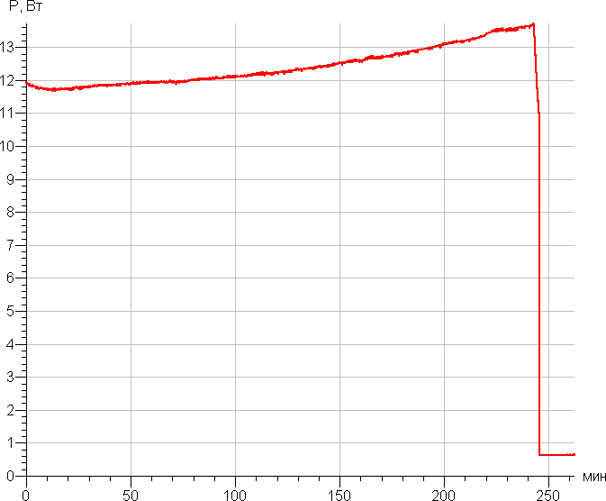 Приведем оставшиеся результаты тестирования. На полную зарядку потребовалось 4 часа 6 минут в первый раз и 4 часа 15 минут во второй. При этом потребление достигало порядка 13,7 Вт. График заряда приведен ниже (указано потребление от сети):