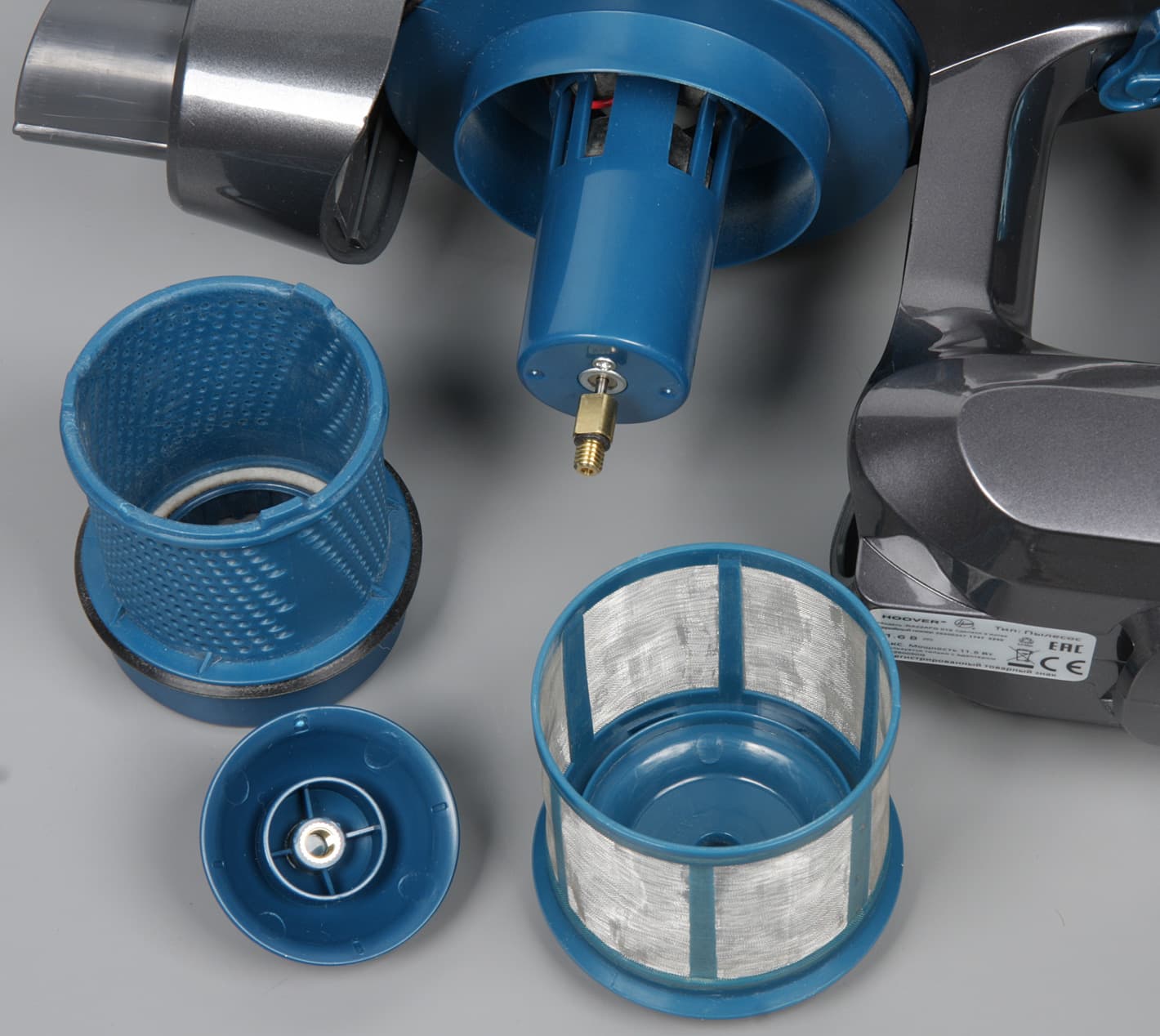 Предмоторного фильтра нет, а на выходе установлен постмоторный волокнистый фильтр.