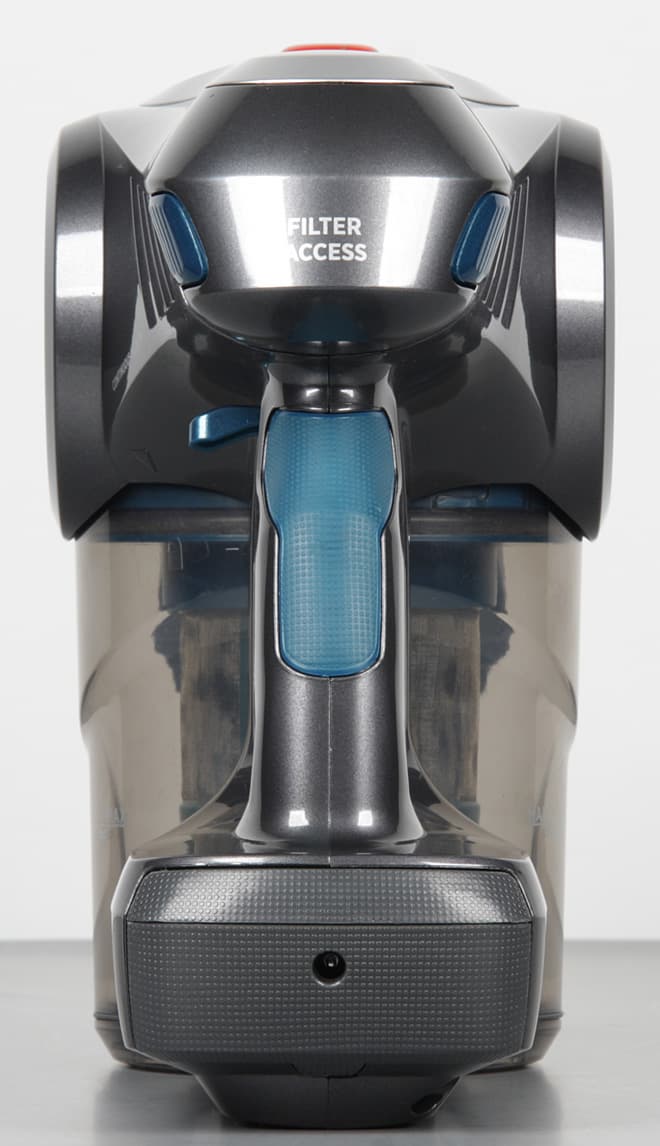 Прозрачный слегка тонированный корпус пылесборника позволяет оценить степень его заполнения с первого взгляда, по крайней мере, пока он несильно поцарапался изнутри. При нажатии на фиксатор дно пылесборника откидывается вниз.