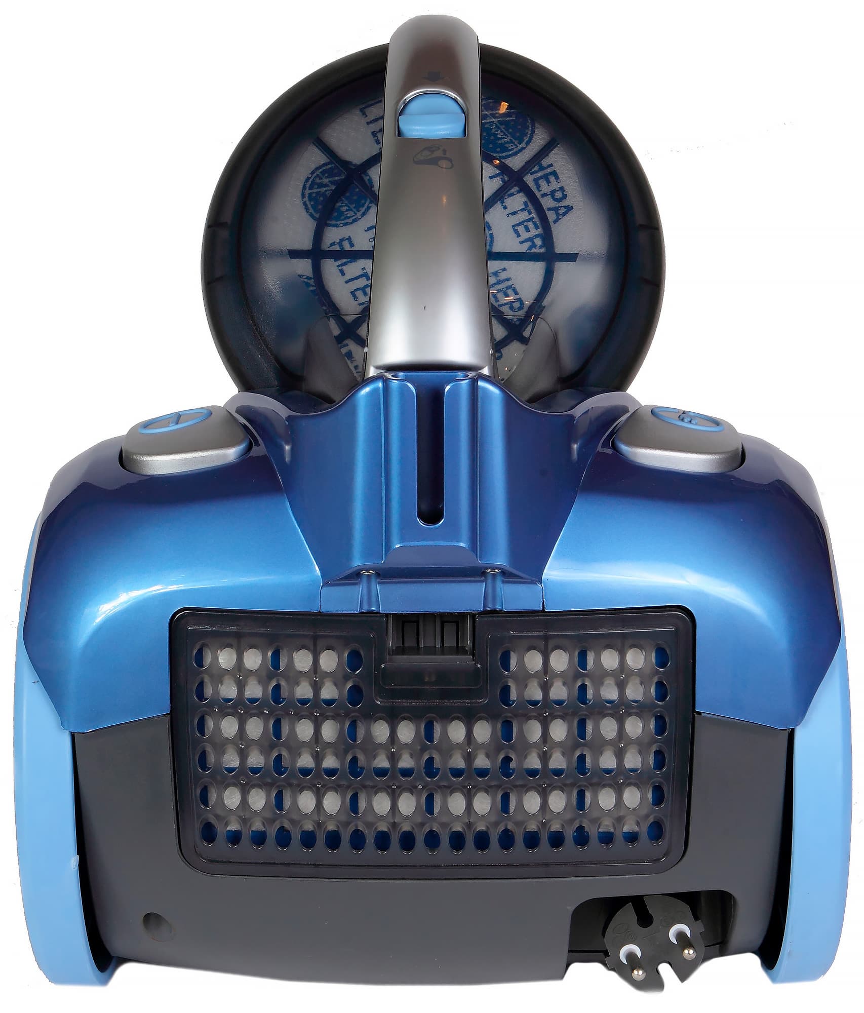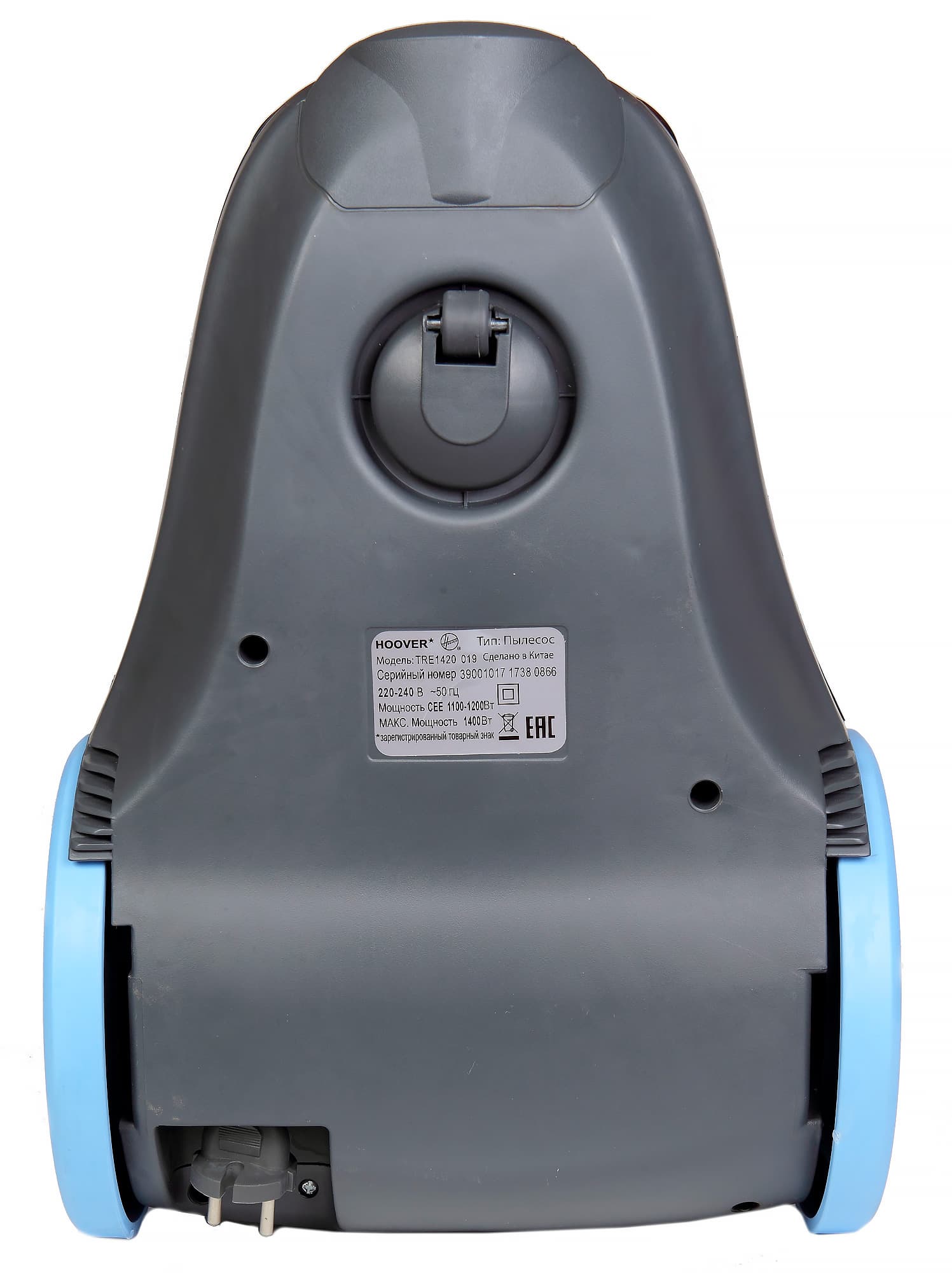 Большие кнопки включения/выключения и сматывания шнура расположены по бокам в задней части корпуса. Отверстие для шланга, традиционно, спереди.