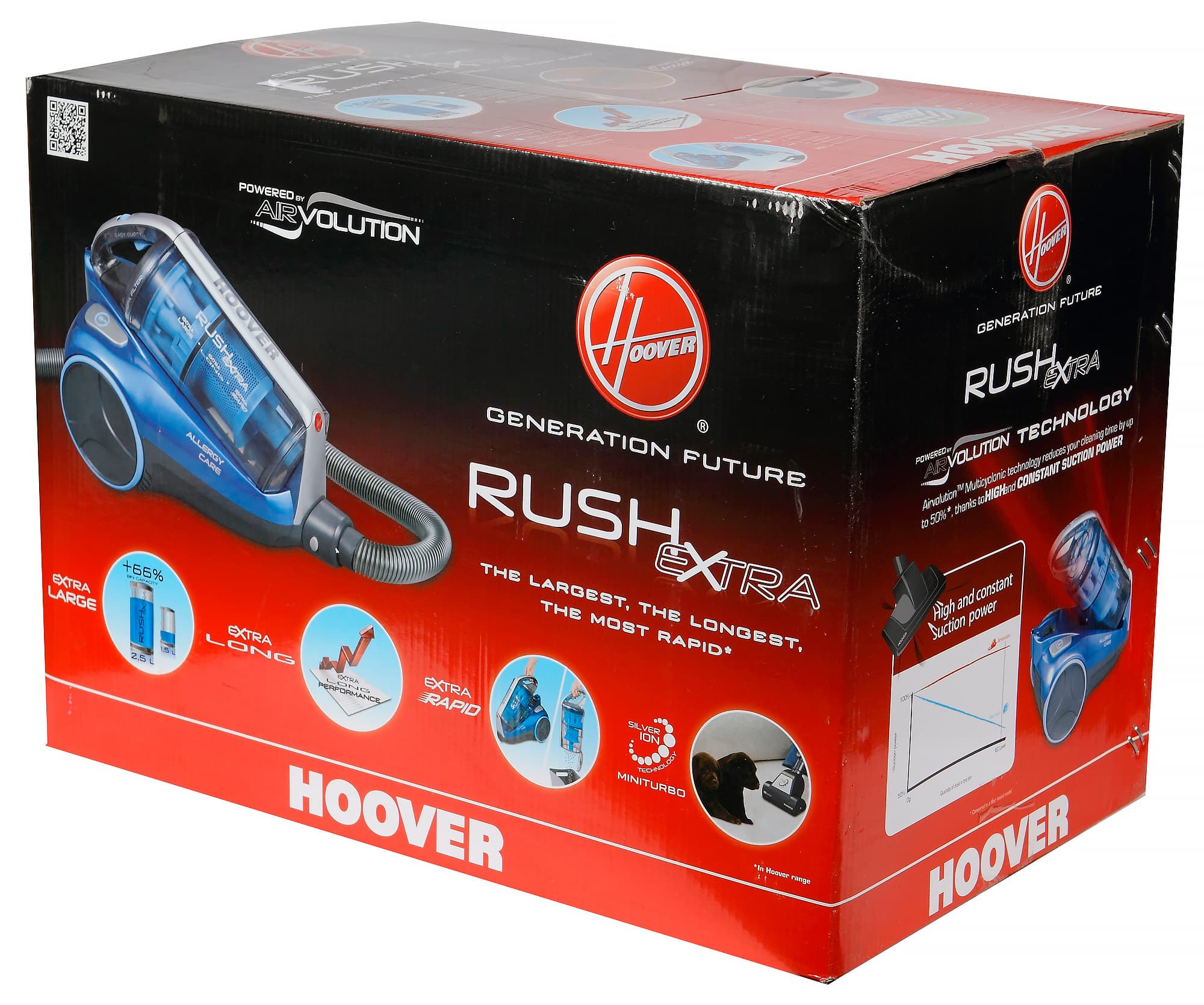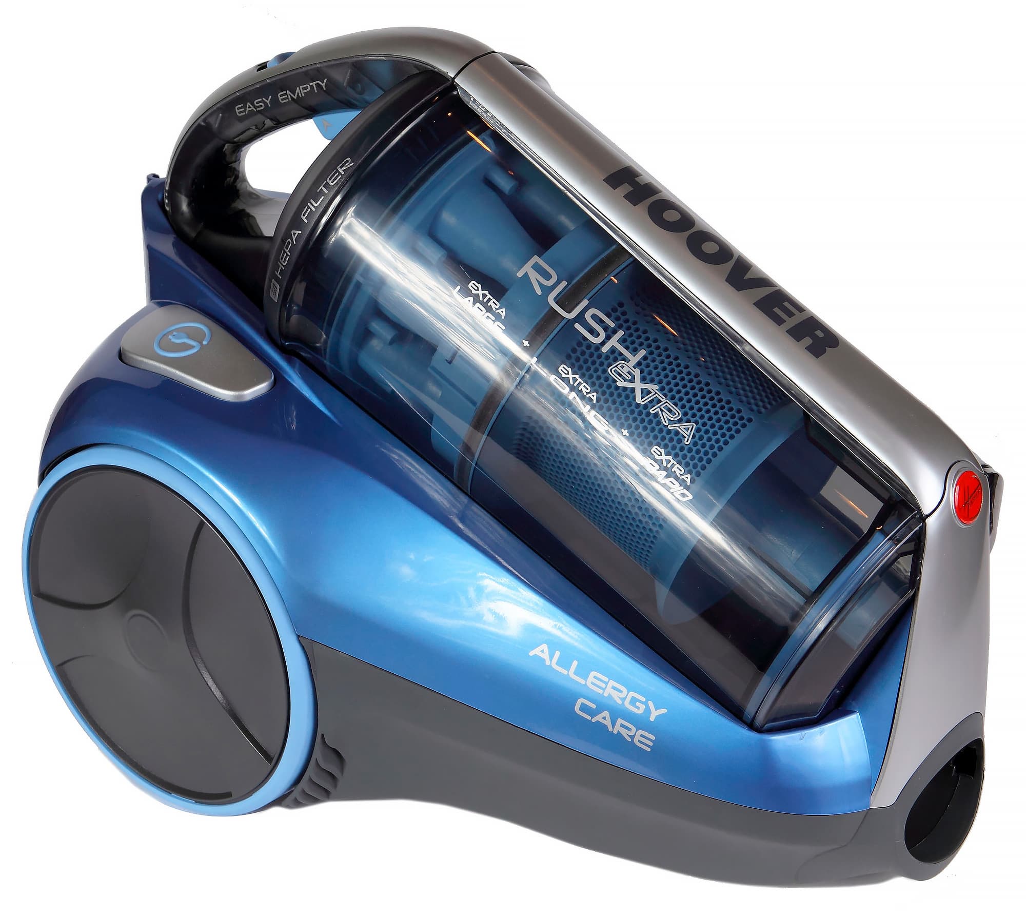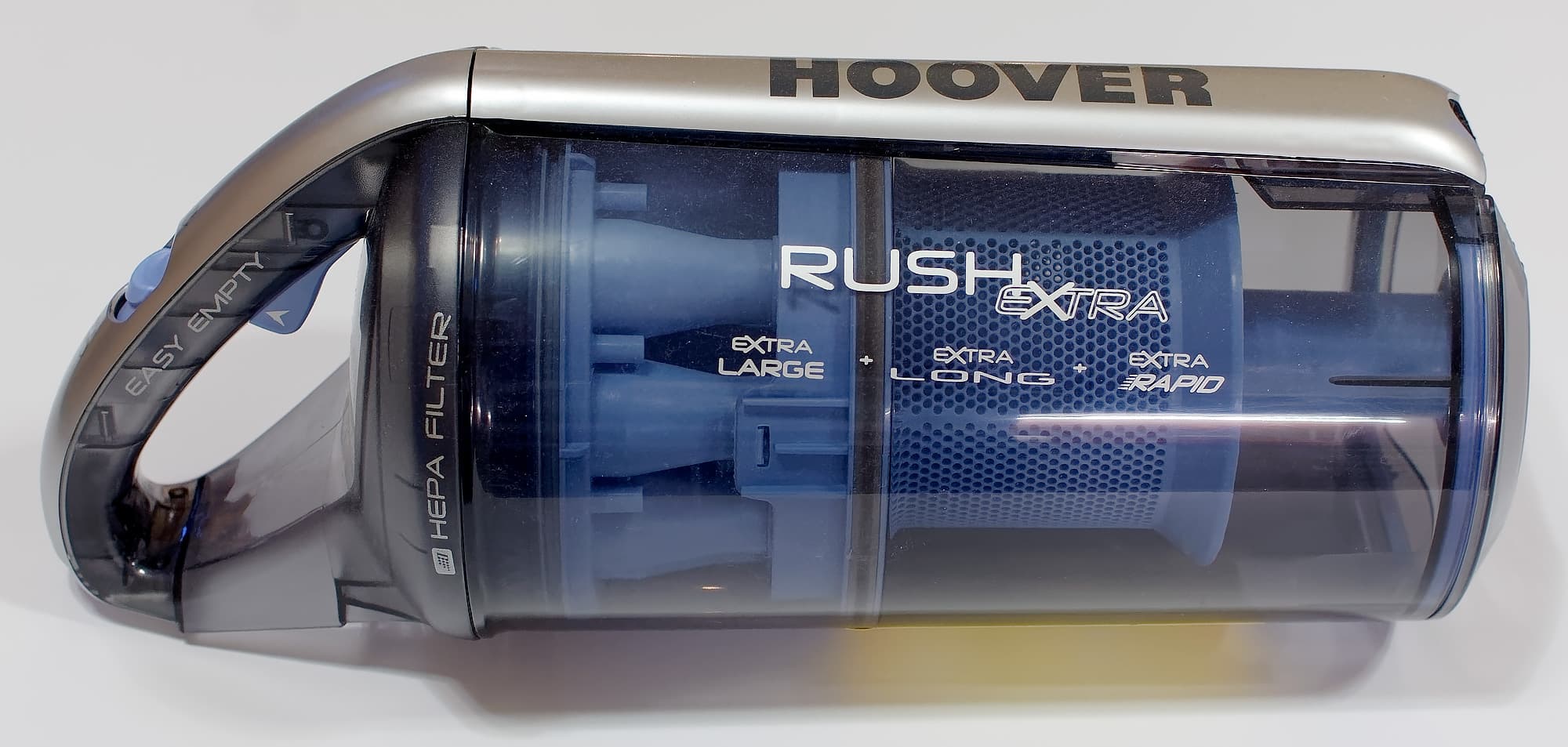 Hoover Rush Extra — большой, довольно тяжелый, довольно шумный пылесос, снабженный хорошим комплектом щеток и насадок, длинным шнуром и большим пылесборником. Он выглядит дороже, чем стоит, и имеет не очень высокую мощность всасывания — которой, впрочем, для задач обычной домашней уборки вполне хватает.