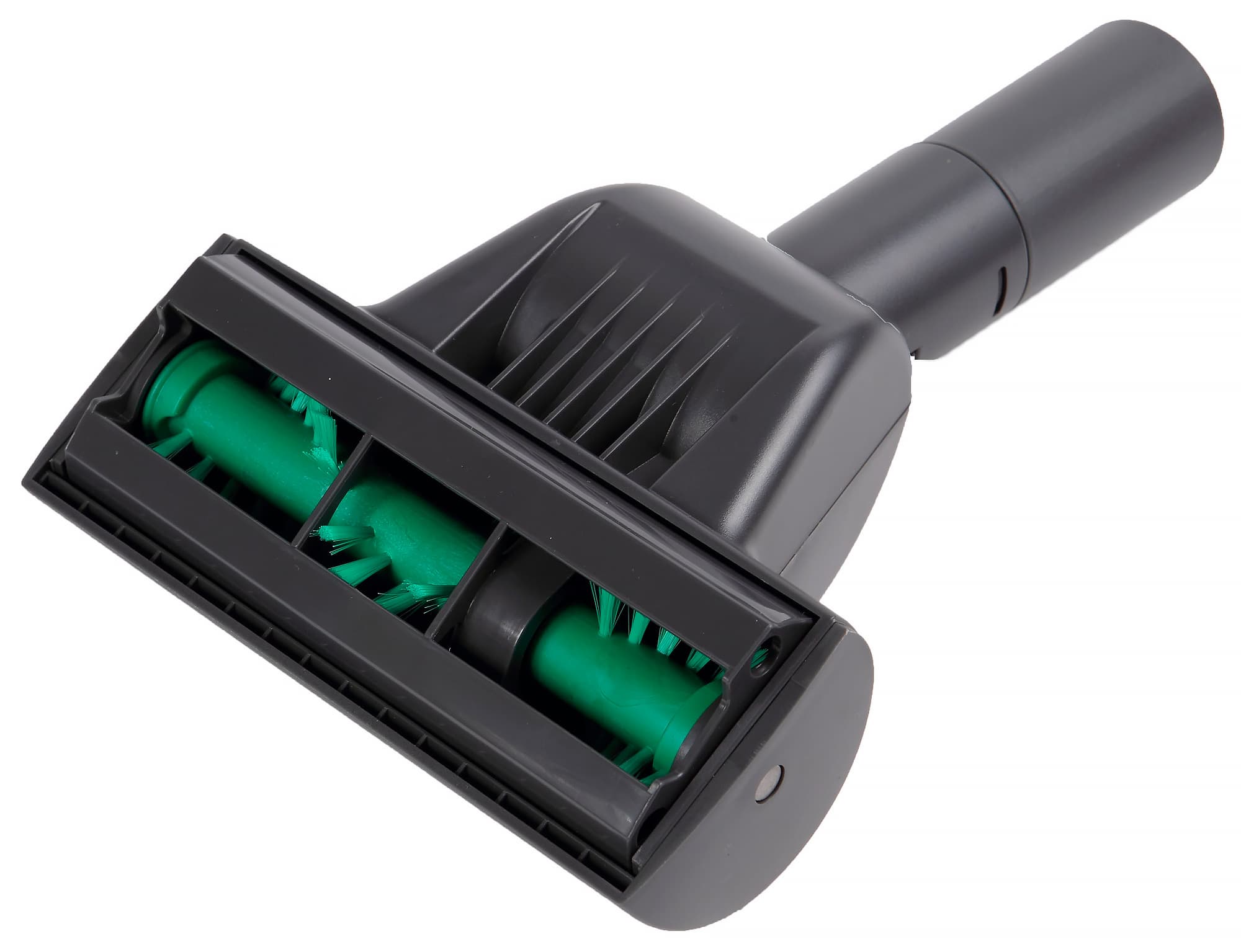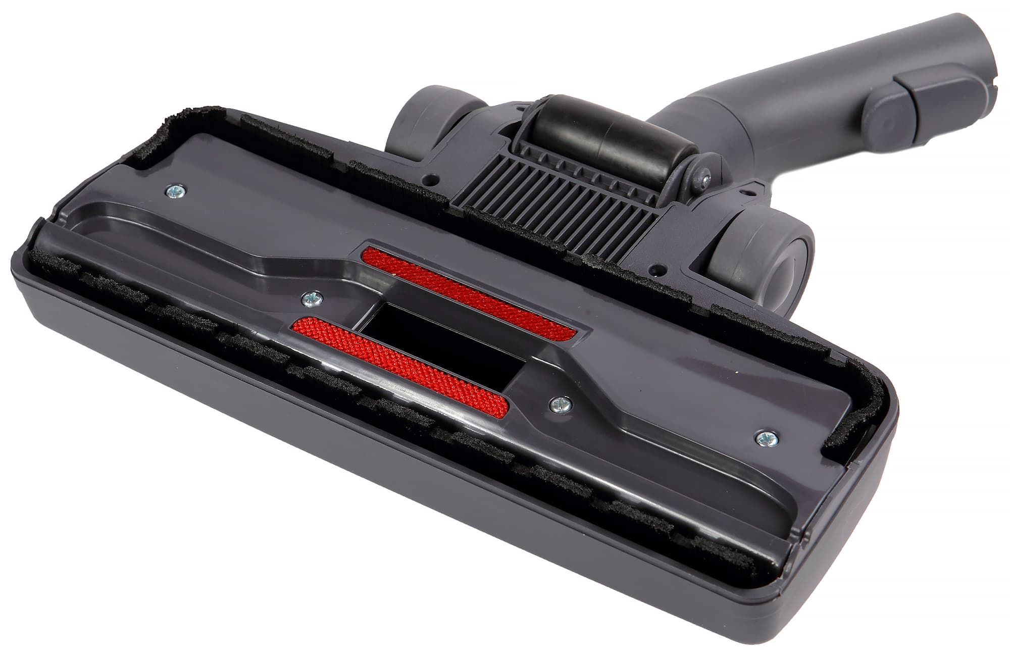 Высота насадки составляет 74 мм, ширина — 286 мм. Сочленение входного жесткого патрубка с корпусом насадки осуществляется через два шарнира с общим ходом в вертикальной плоскости порядка 40 градусов вверх от горизонтального положения. Колесики с покрышками из упругого пластика, установленные под шарниром, и широкий ролик с покрышкой из резины облегчают перемещение насадки по полу. Отметим наличие перепускных окон в рядах щетины и по бокам.