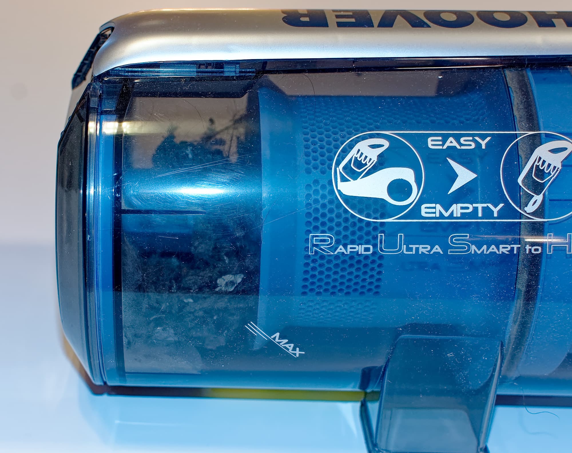 Мусор в пылесборнике виден примерно так же, как на фотографии выше — в принципе, виден. На этом же фото можно увидеть основной недостаток отметки «Max» — мусор, особенно легкий, упорно не желает скапливаться исключительно внизу, «наматываясь» вокруг трубки циклона, поэтому пользы от нее по факту никакой.