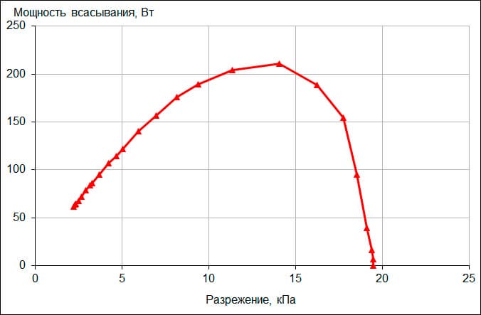 Мощность всасывания (что это такое и как мы ее измеряем, описано в отдельной статье) мы определяли при работе пылесоса без трубы и насадок. Зависимость мощности всасывания от создаваемого разрежения приведена на графике ниже: