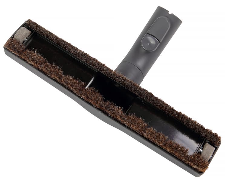 У щетки для паркета два ряда мягкой щетины, видимо, натуральной. В переднем ряду есть перепускные окна для подбора крупного мусора. Боковые ролики облегчают перемещение насадки по полу и не дают пластиковому корпусу щетки соприкасаться с полом и царапать его. Ролики изготовлены из войлока, что также снижает вероятность оставления царапин на нестойких к повреждениям полах. Высота насадки составляет 70 мм, ширина — 300 мм.