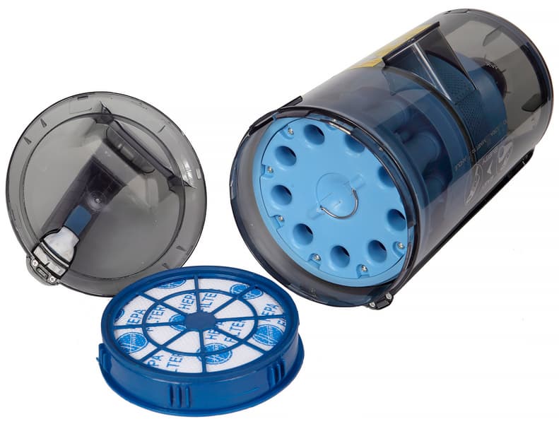 Система фильтрации многоступенчатая. Сначала большой циклон и крупноячеистая сеточка отделяют крупный мусор, далее 9 мелких циклонов сепарируют воздух и мелкую пыль, все, что прошло, задерживается предмоторным фильтром, а финальную очистку воздуха выполняет выпускной фильтр HEPA.