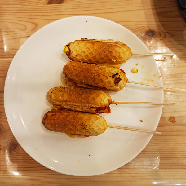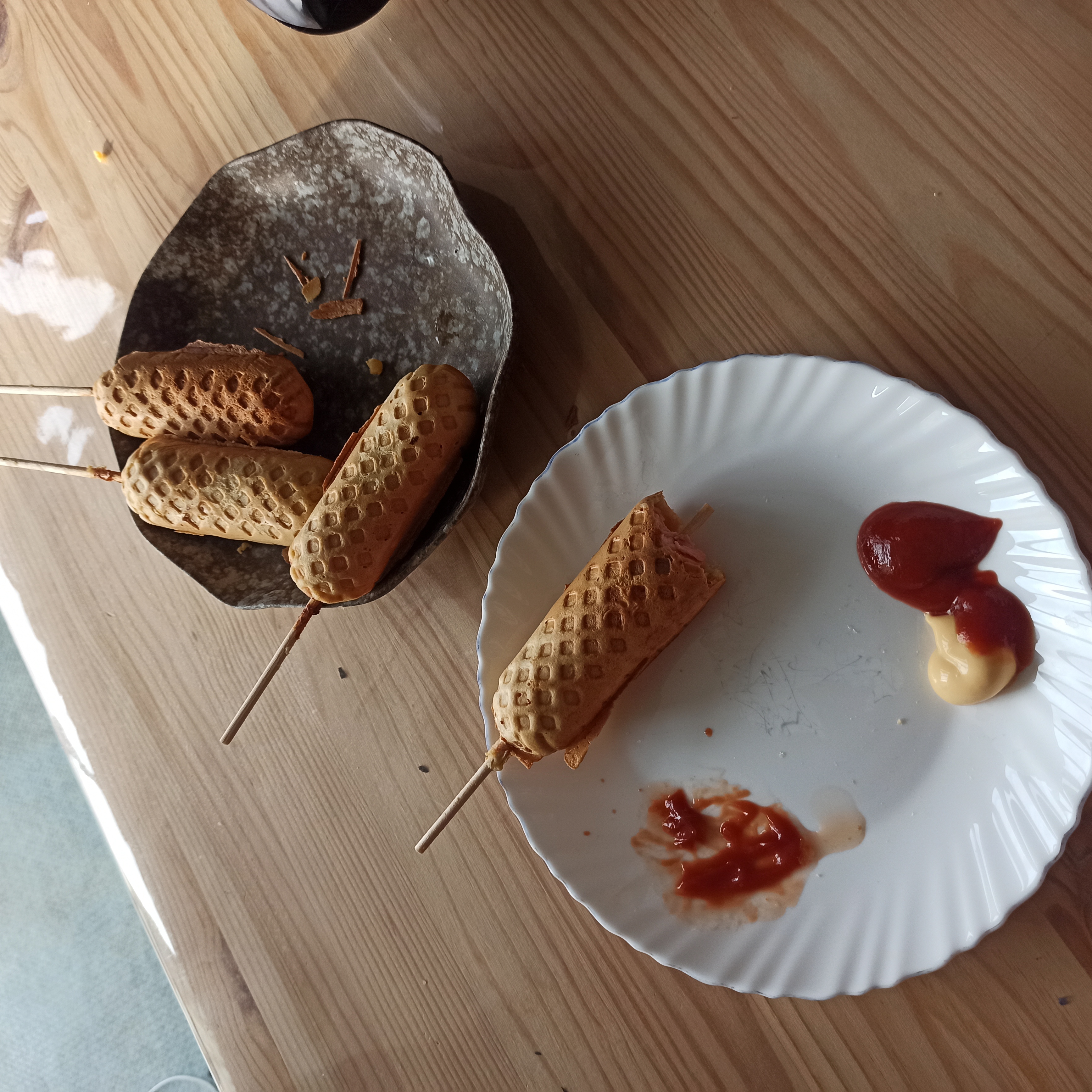 Внешне заметна некоторая неравномерность в степени пропеченности, но это оказалось некритично для вкуса. Выпечка корн-догов заняла 8 минут.