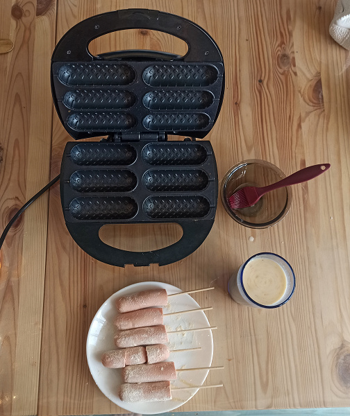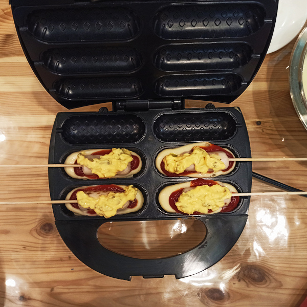 - для приготовления корн-догов (сосисок на палочке) — тогда сосиску, надетую на деревянную шпажку, сначала окунаем в тесто, затем кладем ее в аппарат, закрываем верхнюю панель и запекаем до готовности