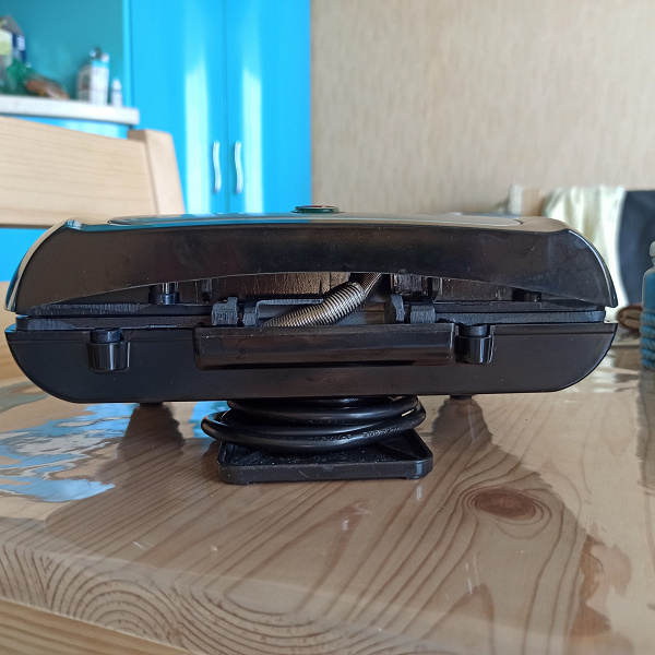 Снизу в передней части корпуса расположены две ножки высотой 2,5 см, которые снабжены резиновыми накладками, третья ножка с более широким плоским основанием обеспечивает прибору устойчивое горизонтальное положение, она также предназначена для наматывания и хранения шнура. На ножке наклеен шильдик, на котором кратко представлены основные технические характеристики.