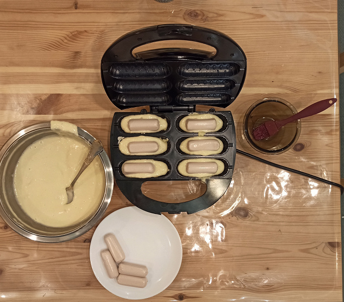 Далее мы заполнили ячейки для хот-догов на нижней панели тестом примерно на половину объема и положили сверху по предварительно отваренной сосиске.