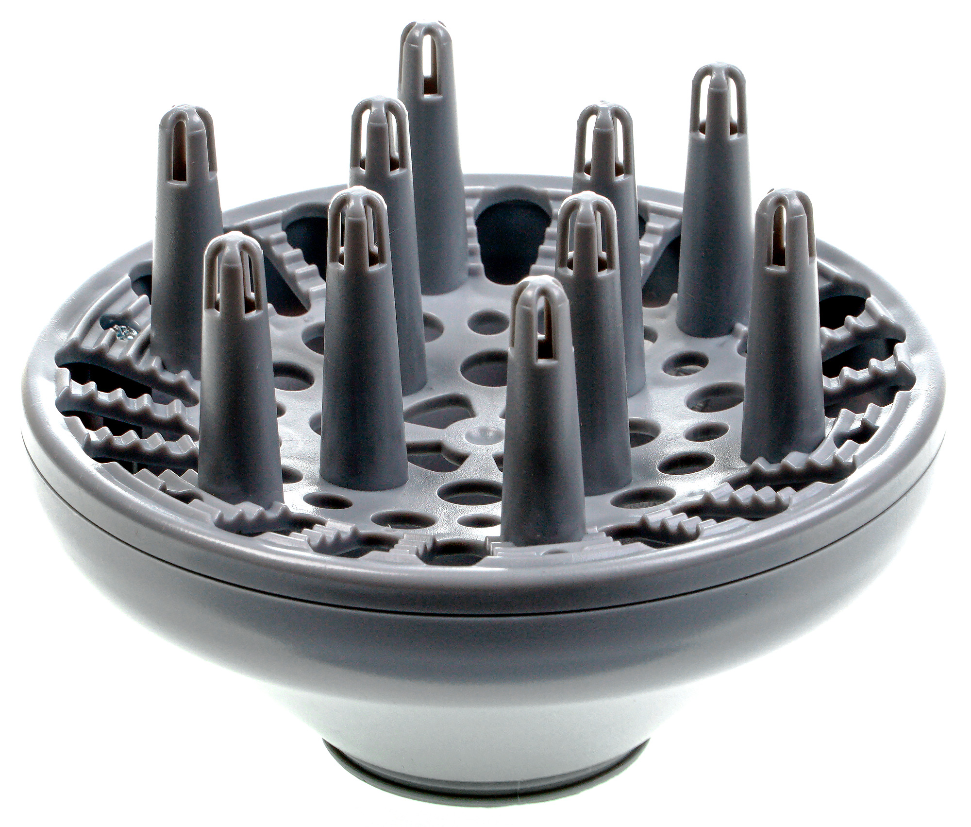 В комплект к прибору входят две насадки: диффузор и концентратор. Чтобы зафиксировать насадку на сопле, следует совместить ее края с соплом и надавить до легкого щелчка. Чтобы снять аксессуар, достаточно лишь слегка за него потянуть. Насадки свободно вращаются вокруг сопла. Диаметр диффузора 12 см, высота «ножек» неодинакова по всей поверхности насадки и варьируется от 4 до 3,5 см.