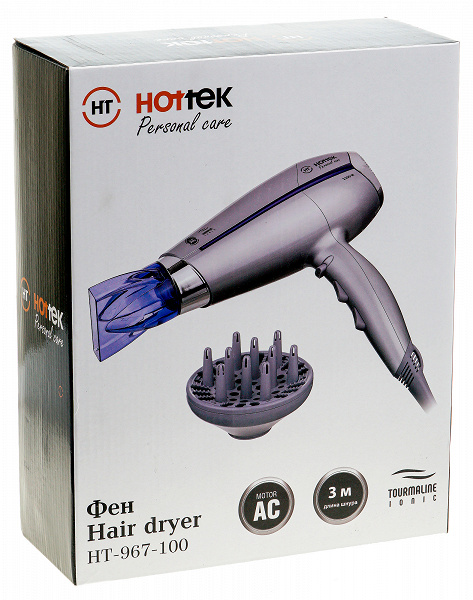 Hottek HT-967-100, попавший в тестовую лабораторию iXBT.com, оснащен всеми типичными функциями мощных фенов для сушки волос. «Турмалиновая ионизация», по словам производителя, предотвращает спутывание волос, делает их более послушными и блестящими. Мощный мотор работает в двух режимах подачи воздуха и трех температурных режимах. Дополнительно в комплект входит насадка-концентратор и диффузор.