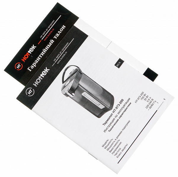 В коробке, снабженной ручкой (при весе термопота это совсем не лишняя опция), находился собственно термопот, отсоединенный от него сетевой кабель, инструкция и гарантийный талон. Все, что необходимо и ничего лишнего.