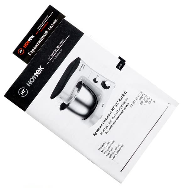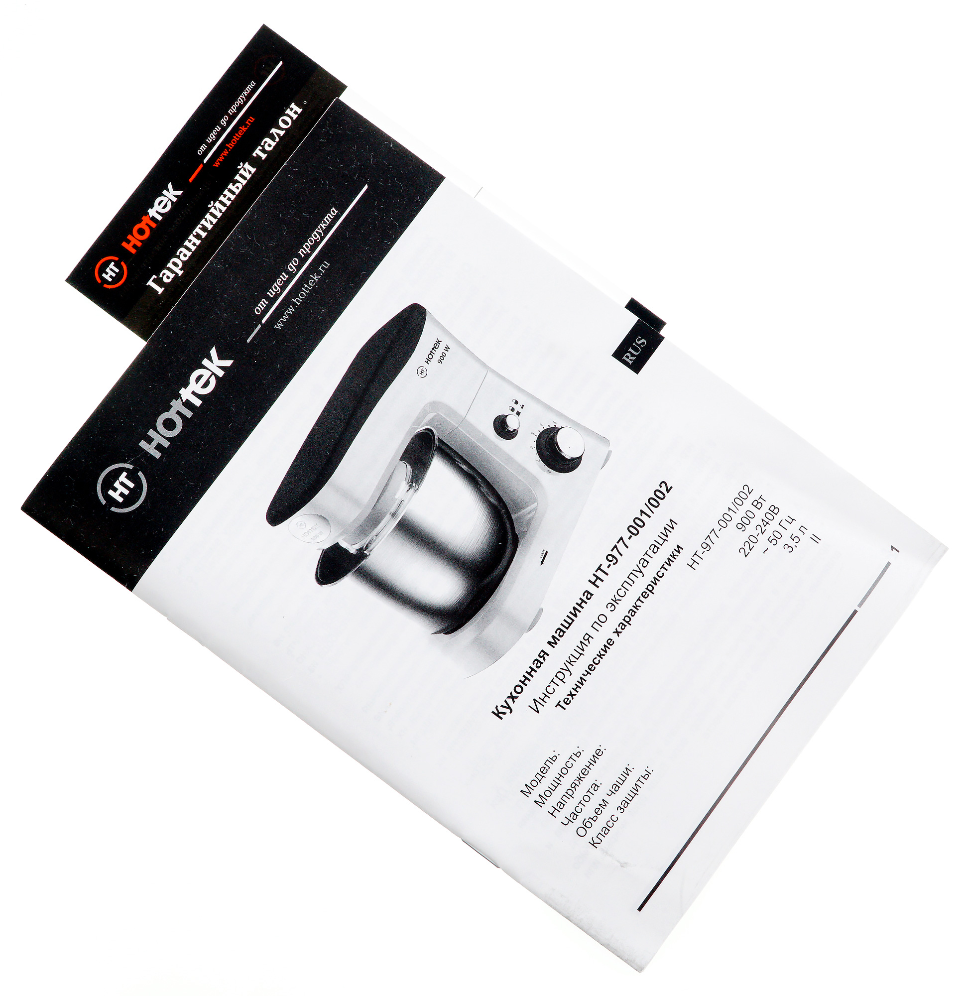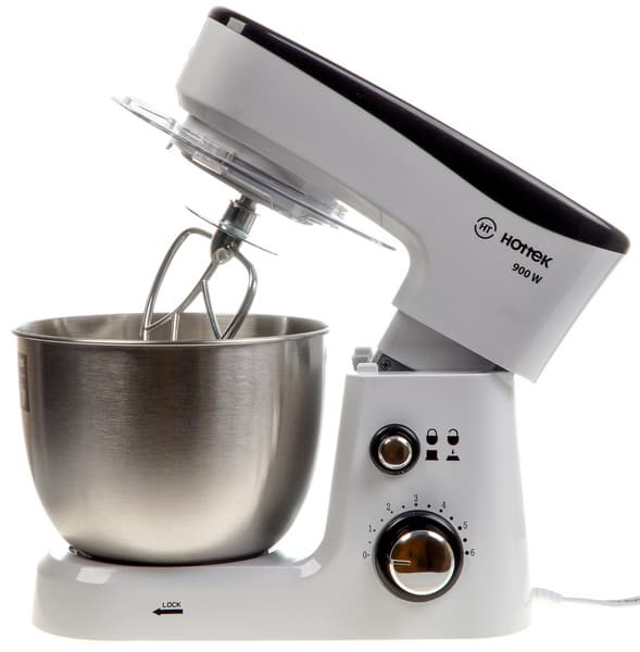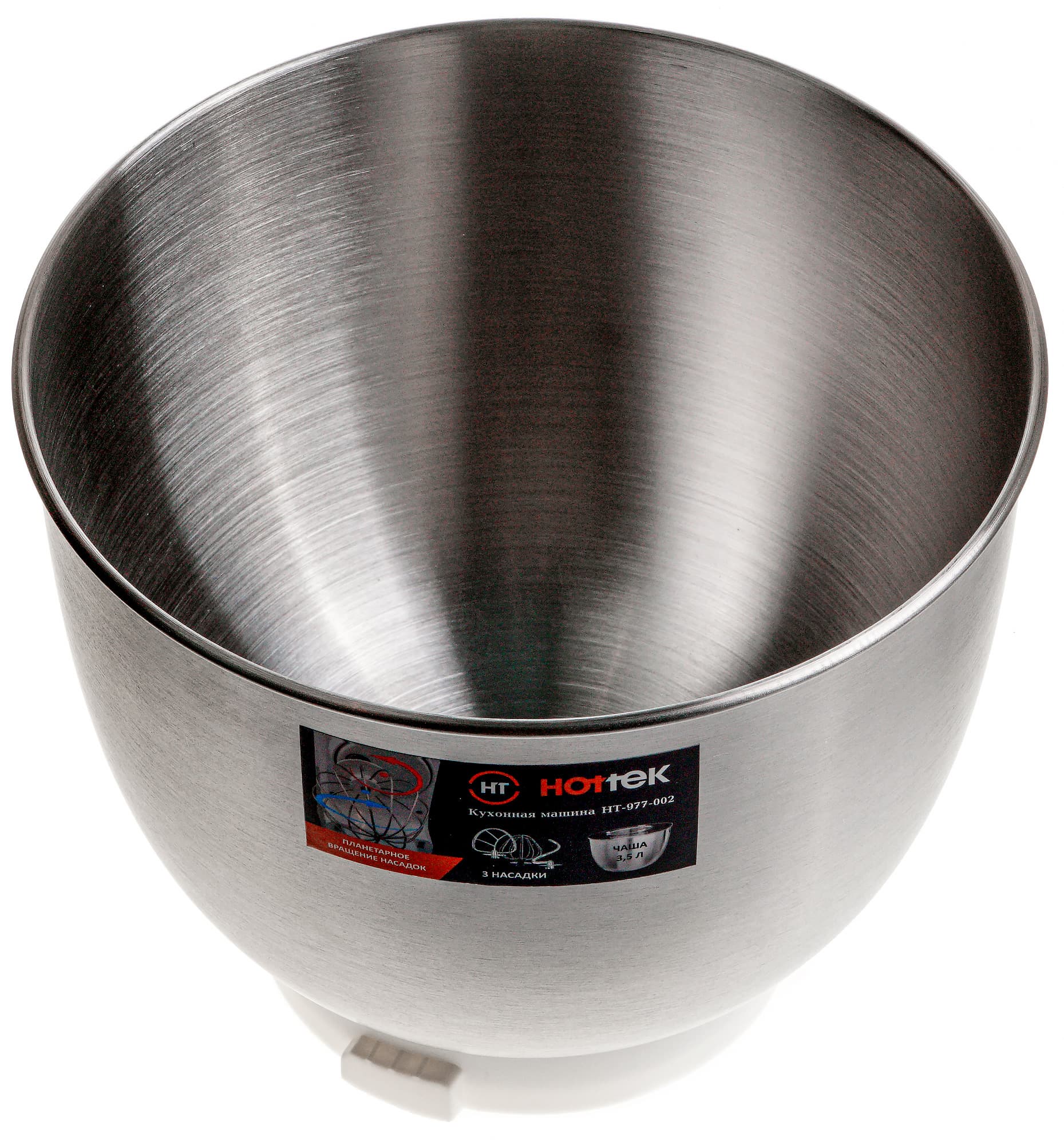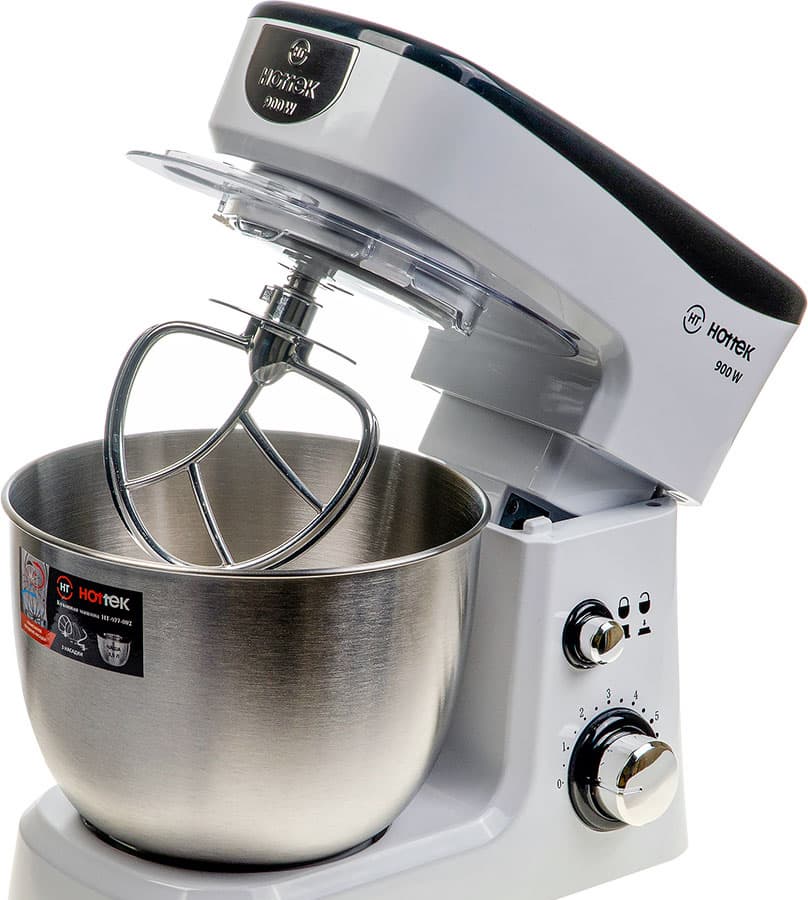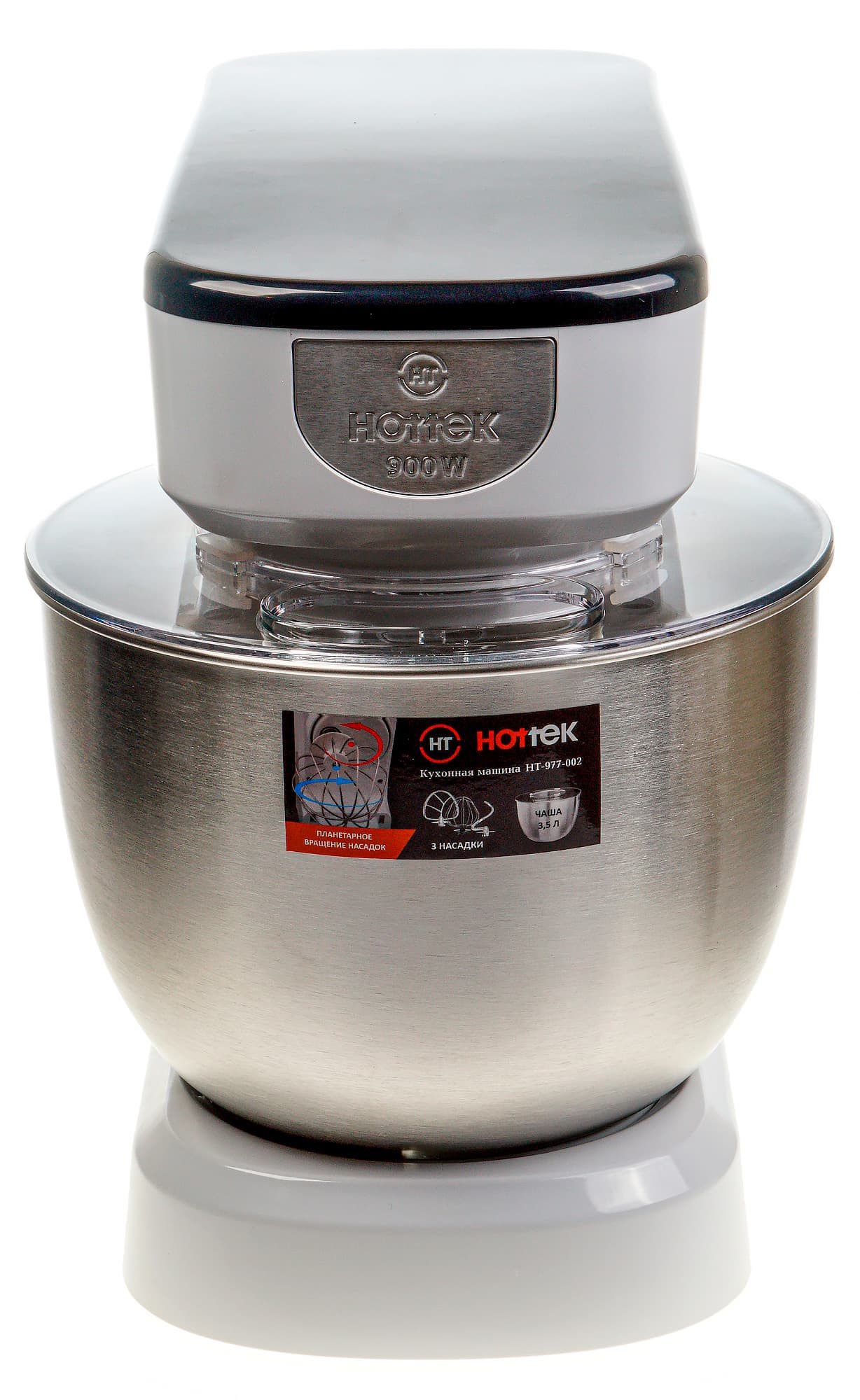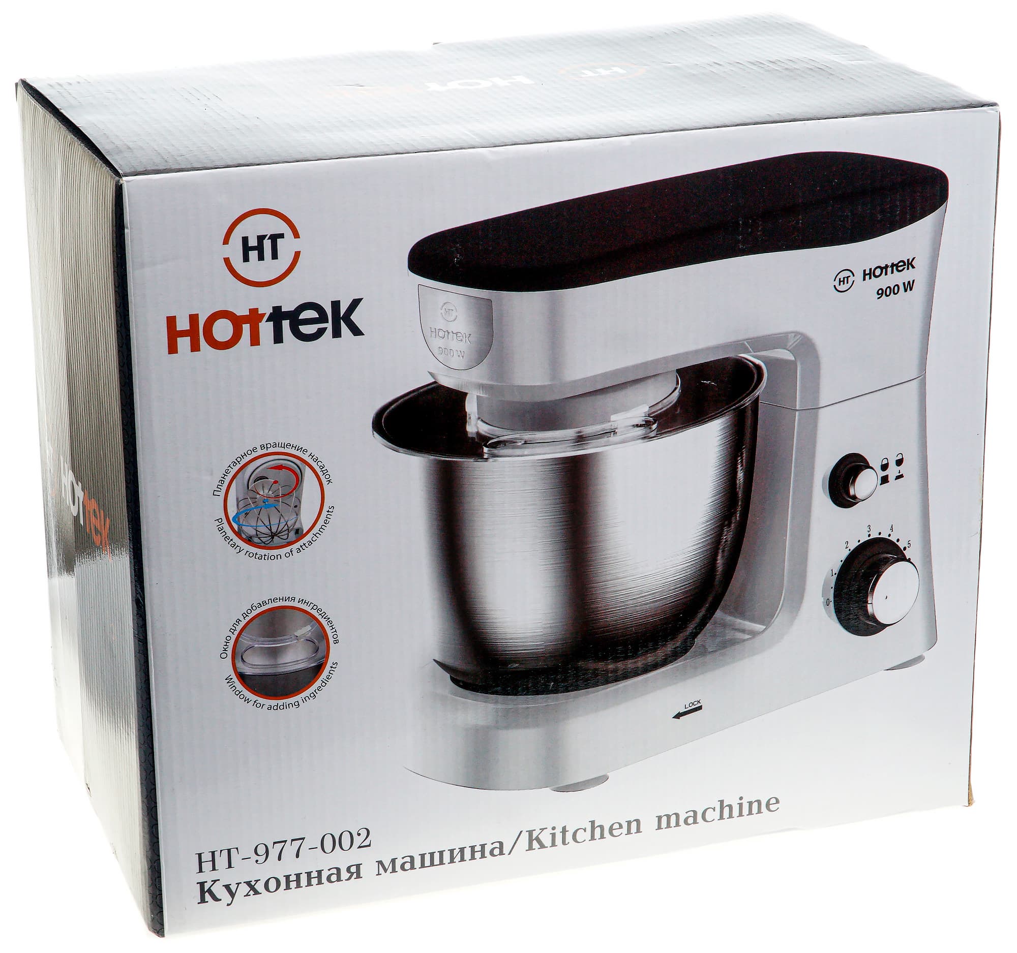 Кухонная машина Hottek HT-977-002 является обычным планетарным миксером. Прибор примечателен своими относительно небольшими габаритами, достаточной мощностью и хорошим исполнением. Миксер не требует особых навыков при работе с ним и радует глаз своим лаконичным дизайном.