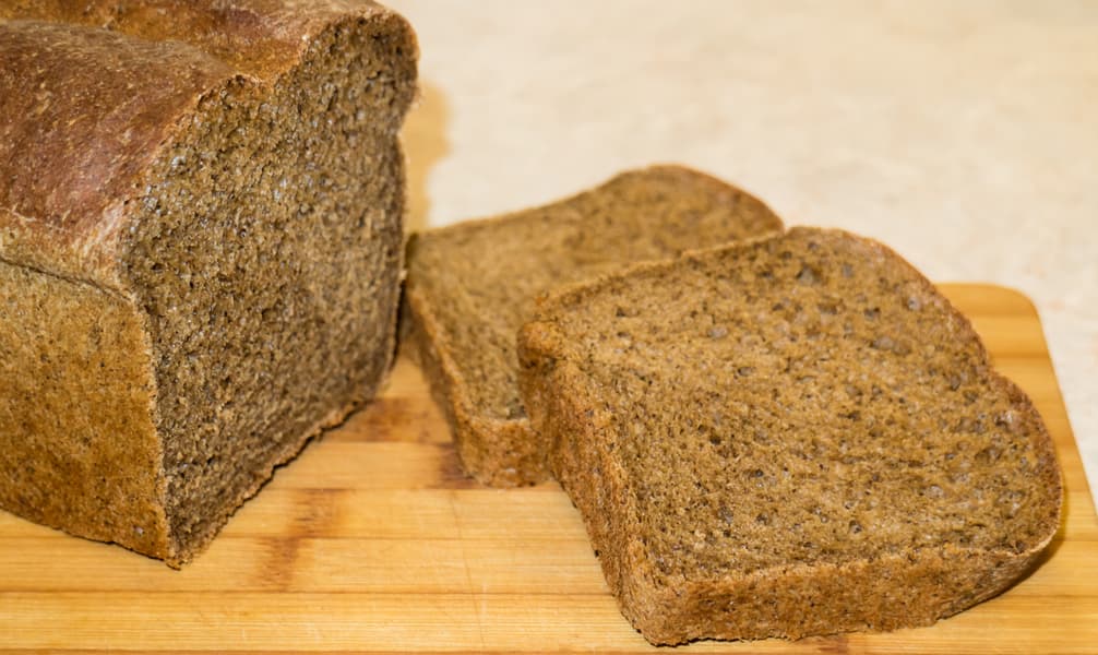 Вода — 260 мл, дрожжи свежие — ¼ пачки, сахар — 2 ч. л., соль — 1 ч. л., масло растительное — 1 ст. л., солод ржаной сухой — 1 ст. л., мука пшеничная — 300 г, мука ржаная — 120 г.