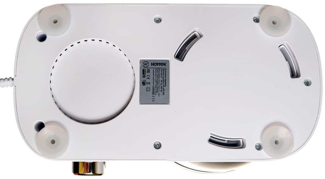 Если взглянуть на прибор со стороны дна, то мы увидим вентиляционные отверстия, размещенные по окружности, наклейку с технической информацией о приборе и четыре прорезиненные ножки, которые чрезвычайно крепко удерживают корпус на месте. Мы бы назвали эти ножки присосками. Забегая вперед расскажем, что присоски настолько хорошо справляются со своим предназначением, что иногда нам приходилось прикладывать значительные усилия, чтобы сдвинуть прибор с места или оторвать его от поверхности стола.
