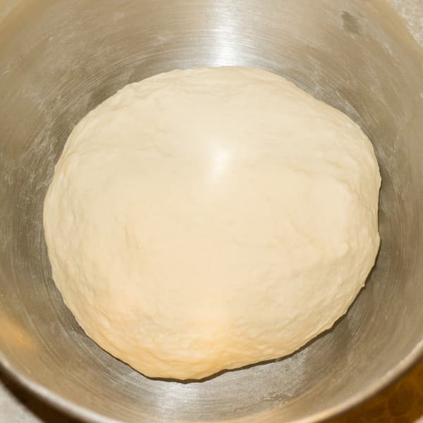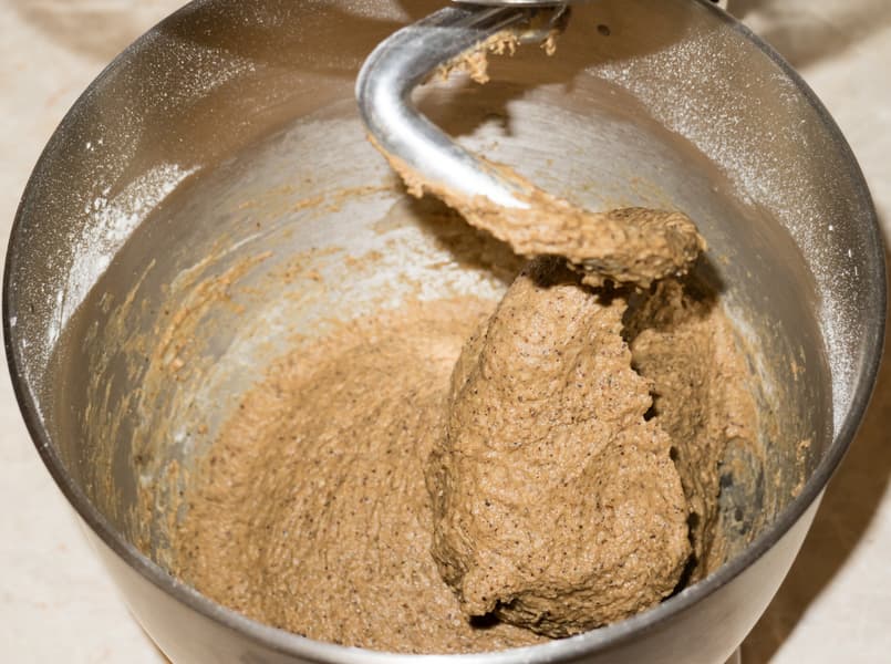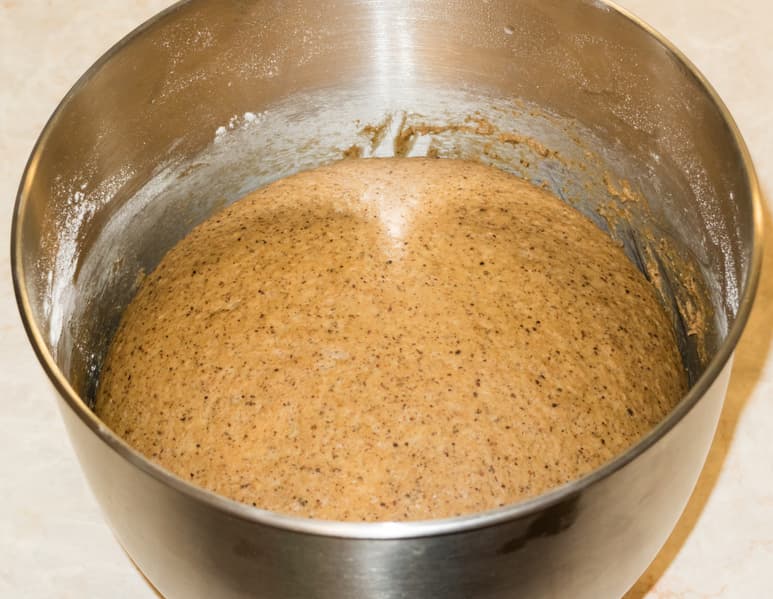 Тесто получилось липкое, не отстающее от стенок дежи. Добавили еще одну столовую ложку пшеничной муки и включили миксер на ту же самую первую скорость. Крюк вращался внутри массы, однако замеса теста о стенки дежи, как это бывает обычно, не происходило. Через три с половиной минуты остановили работу. Ситуация изменилась незначительно — тесто все также прилипало к рукам. При этом оно было уже достаточно плотным для дрожжевого хлебного теста. Смазали ладони растительным маслом и собрали его со стенок и крюка в единый комок. Накрыли салфеткой и поставили в теплое место на расстойку.