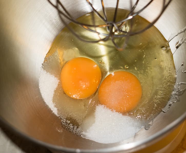 Взяли два яйца, добавили соль, сахар и перемешали на средней скорости в течение 30 секунд. Затем влили молоко, растительное масло, добавили муку и разрыхлитель. Работали на скорости 2—4. Всего тесто взбивалось 6 минут.