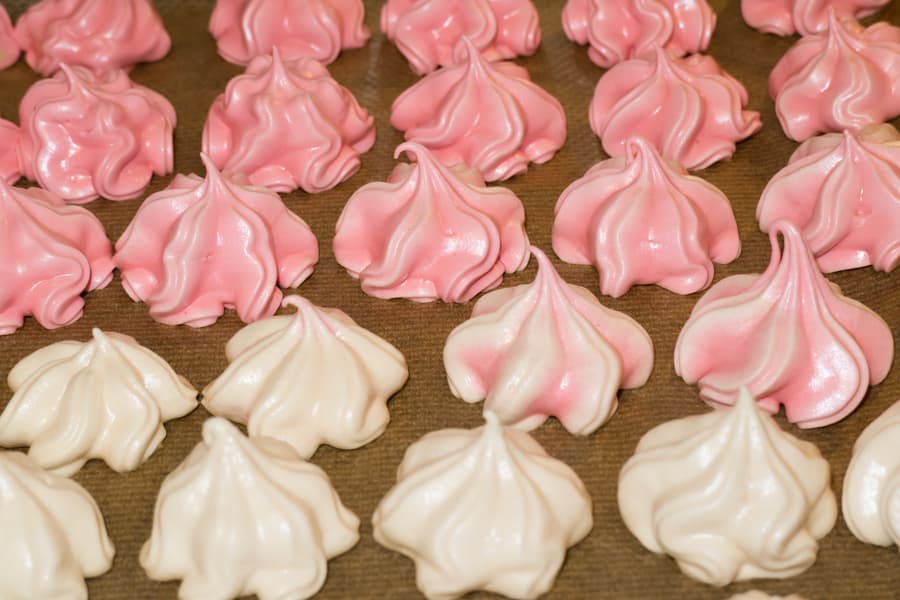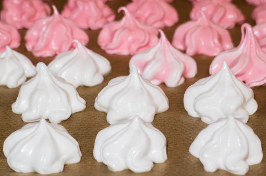 Разделили крем на три части. В одну добавили каплю красного красителя, в другую — зеленого, третью часть оставили белой. С помощью кондитерского мешка отсадили меренгу на противень, проложенный пергаментом.