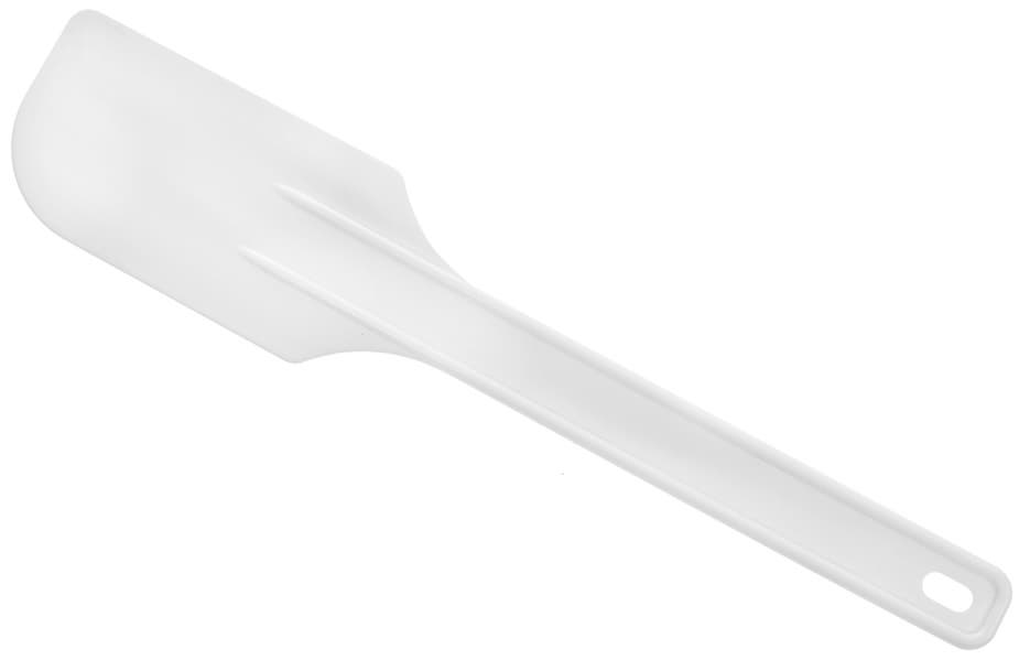 Дополнительно прибор укомплектован пластиковой лопаткой. Ручка жесткая, нижняя и боковая части более мягкие. Аксессуар наверняка будет уместен при извлечении содержимого из чаши миксера.