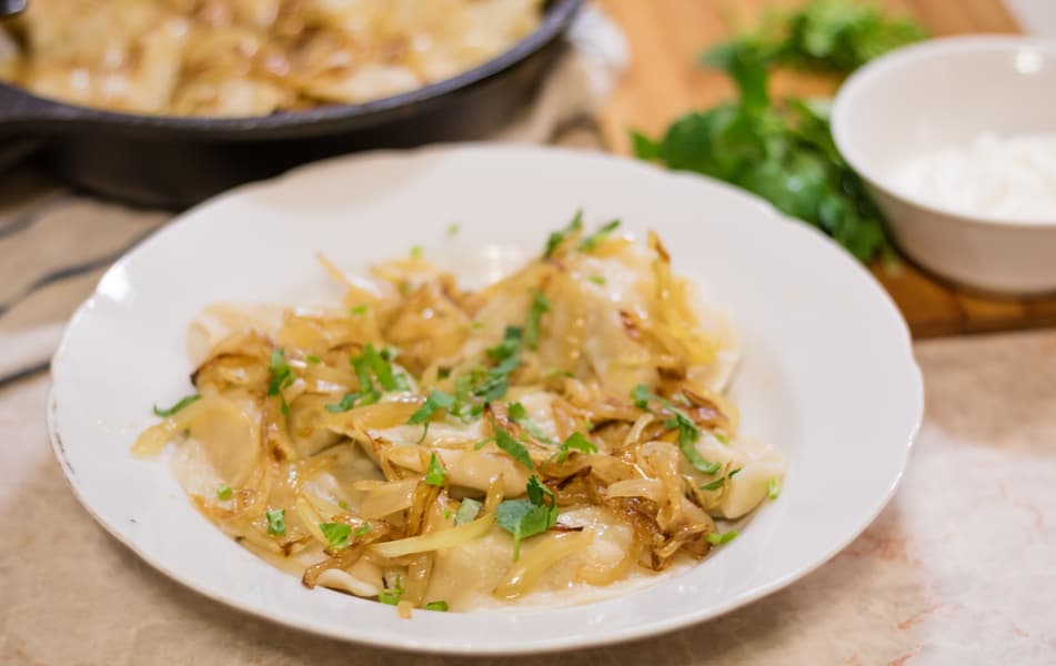 Пока готовили вареники, поджарили на сливочном масле нарезанную тонкими кольцами луковицу. Когда вареники сварились, выложили их на сковороду с луком и хорошо перемешали.