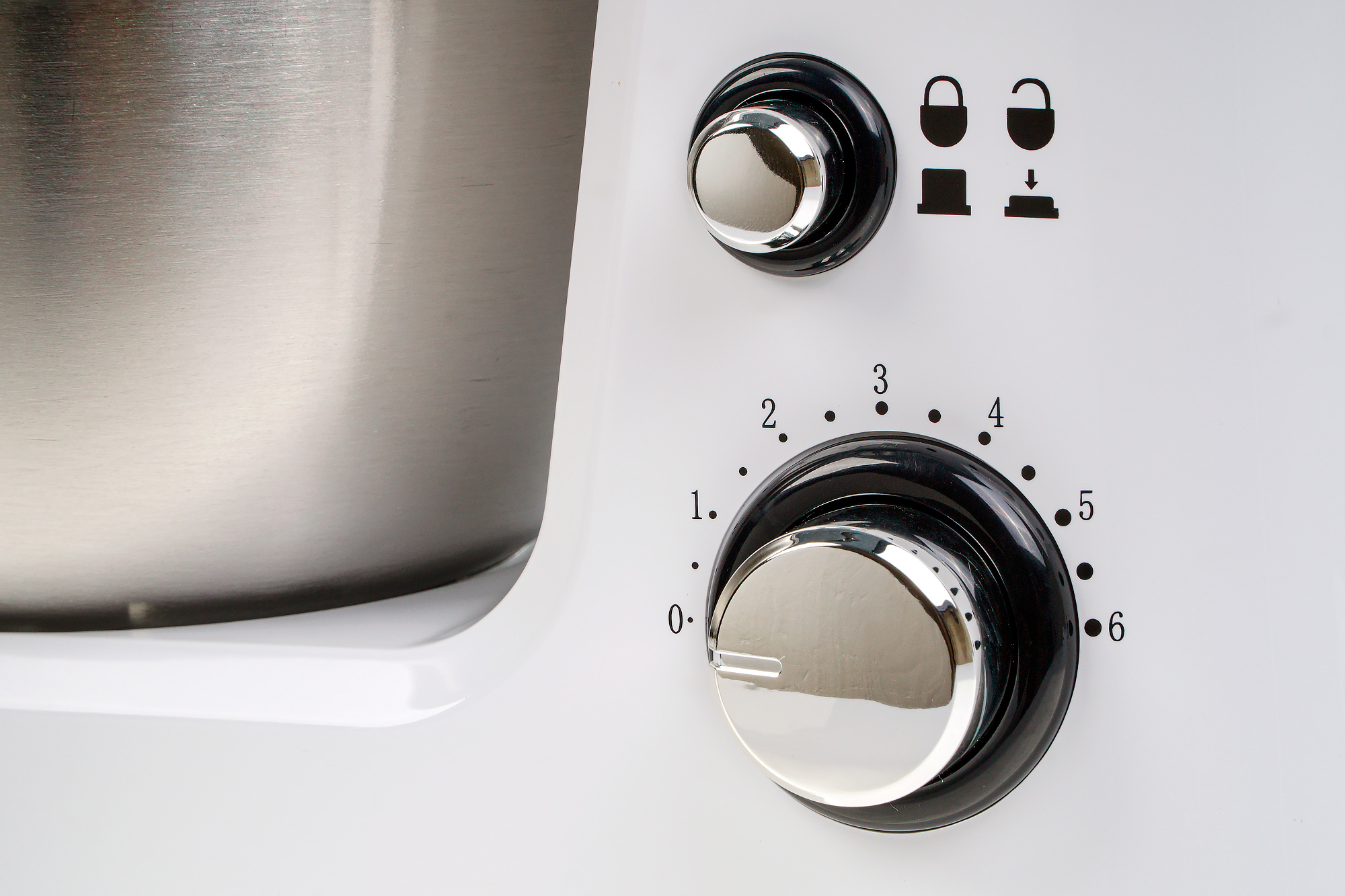 Управлять кухонной машиной Hottek HT-977-002 проще простого: при нажатии на кнопку разблокировки откидывается или, наоборот, опускается моторная головка, при вращении регулятора скоростей миксер начинает работу и изменяет скорость вращения насадки.
