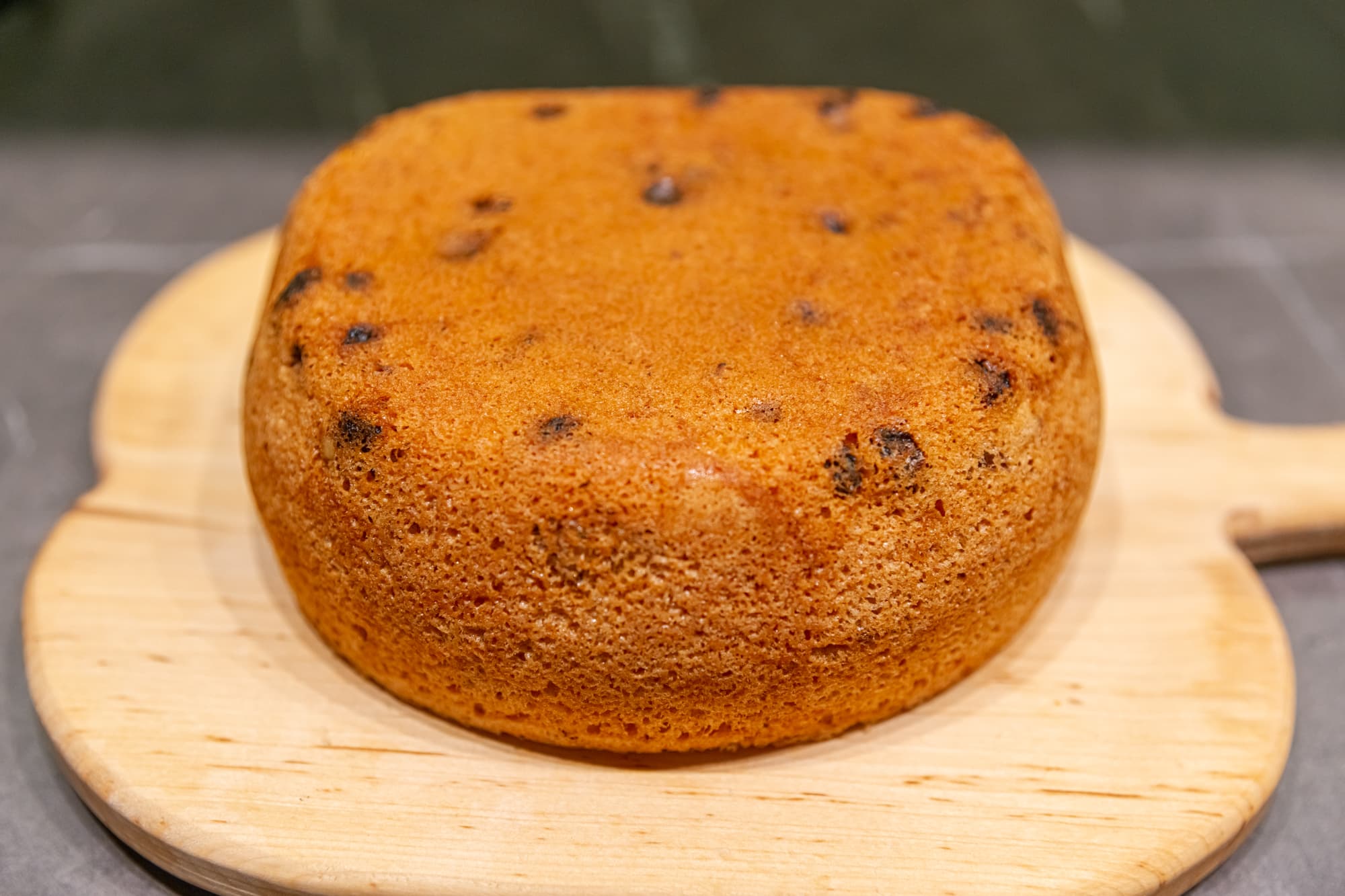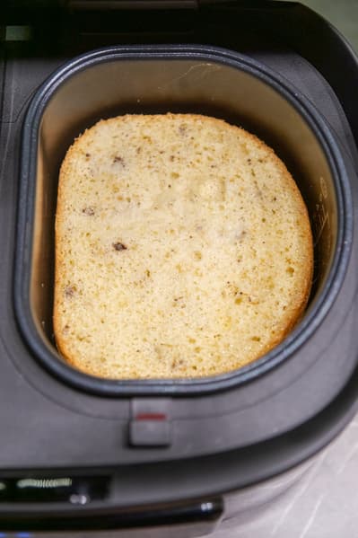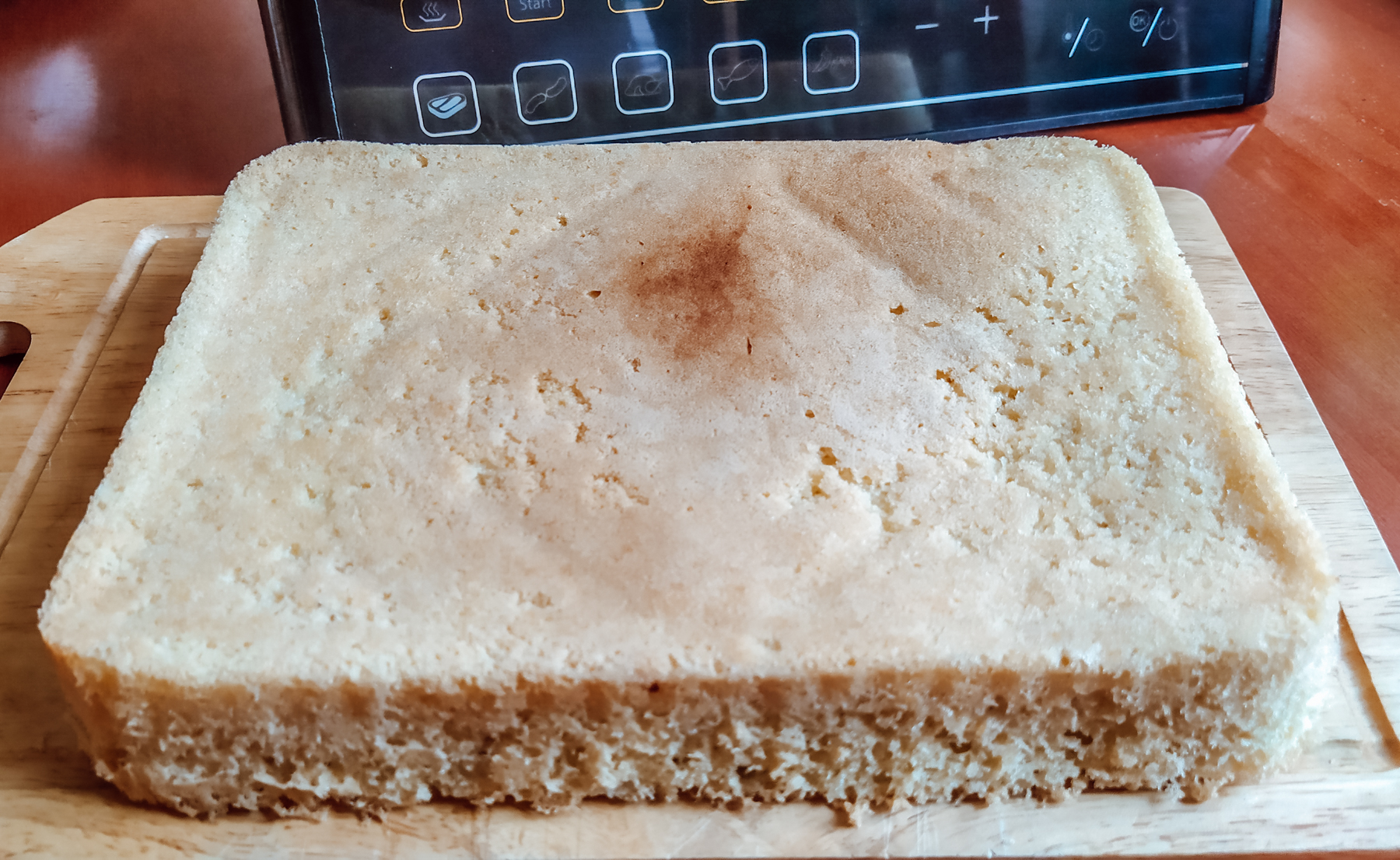 Через 50 минут появился роскошный бисквит высотой 5,5 см. За это время он отлично пропекся и не подгорел. Мы оставили его в чаше с открытой крышкой еще на 15 минут. Потом накрыли чашу контейнером для варки на пару́, перевернули, и таким образом целый и невредимый он продолжил остывать, не намокая снизу, прямо на контейнере.
