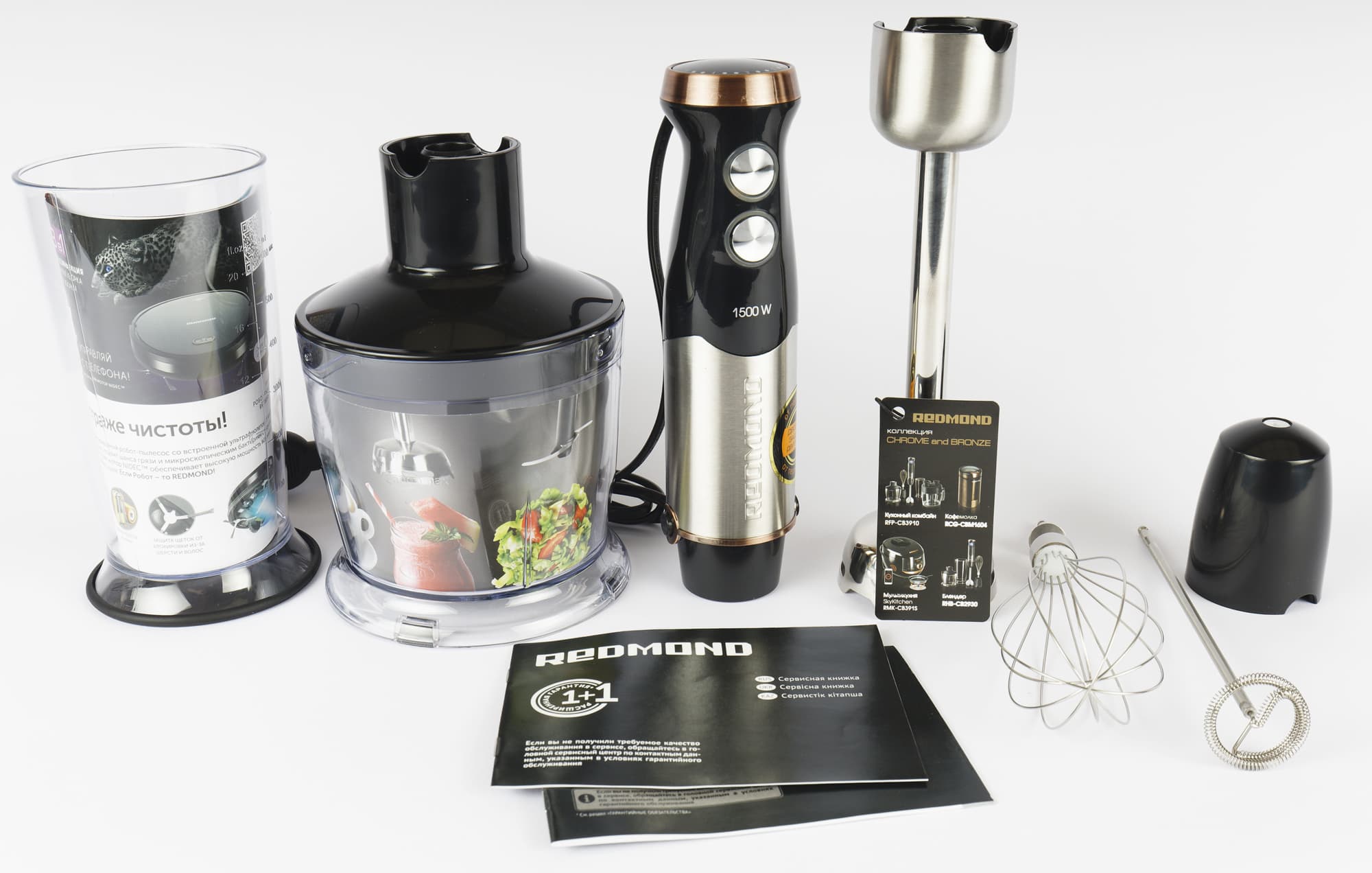 Моделей, в комплекте которых есть насадка для приготовления капучино, не очень много, но найти можно, и если вы находитесь в поиске сразу и погружного блендера, и капучинатора, то стоит обратить внимание на комплектацию первого. Насадка для вспенивания молока представляет собой такой же маленький пружинный венчик, как у ручных вспенивателей. В качестве примеров назовем протестированные нами погружной блендер Redmond RHB-CB2986 и модели Brayer: BR1252, BR1256 и BR1257.