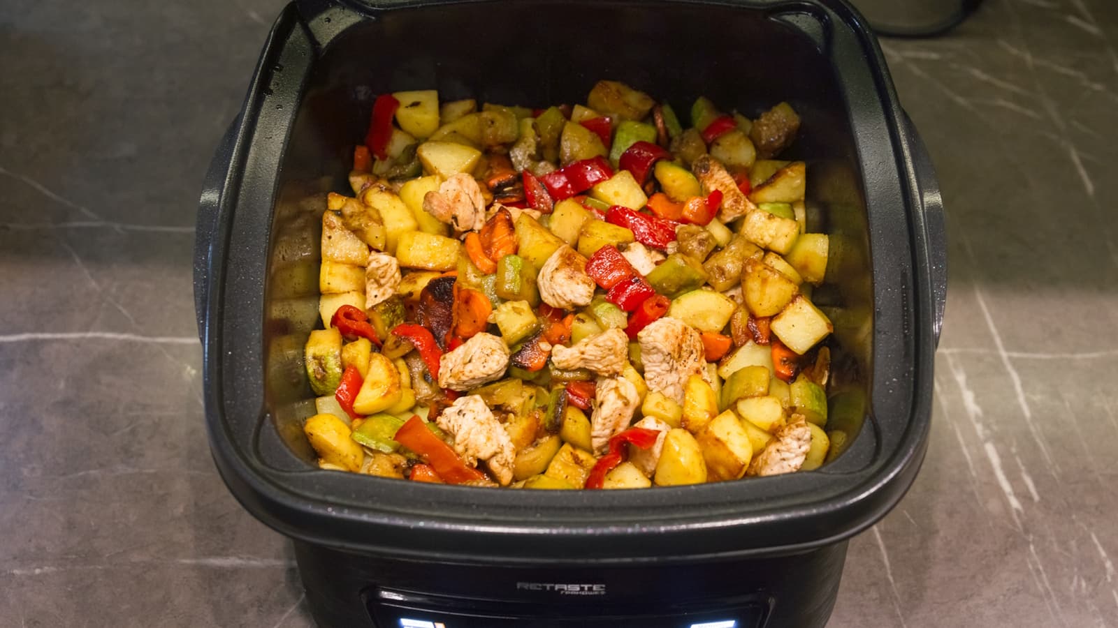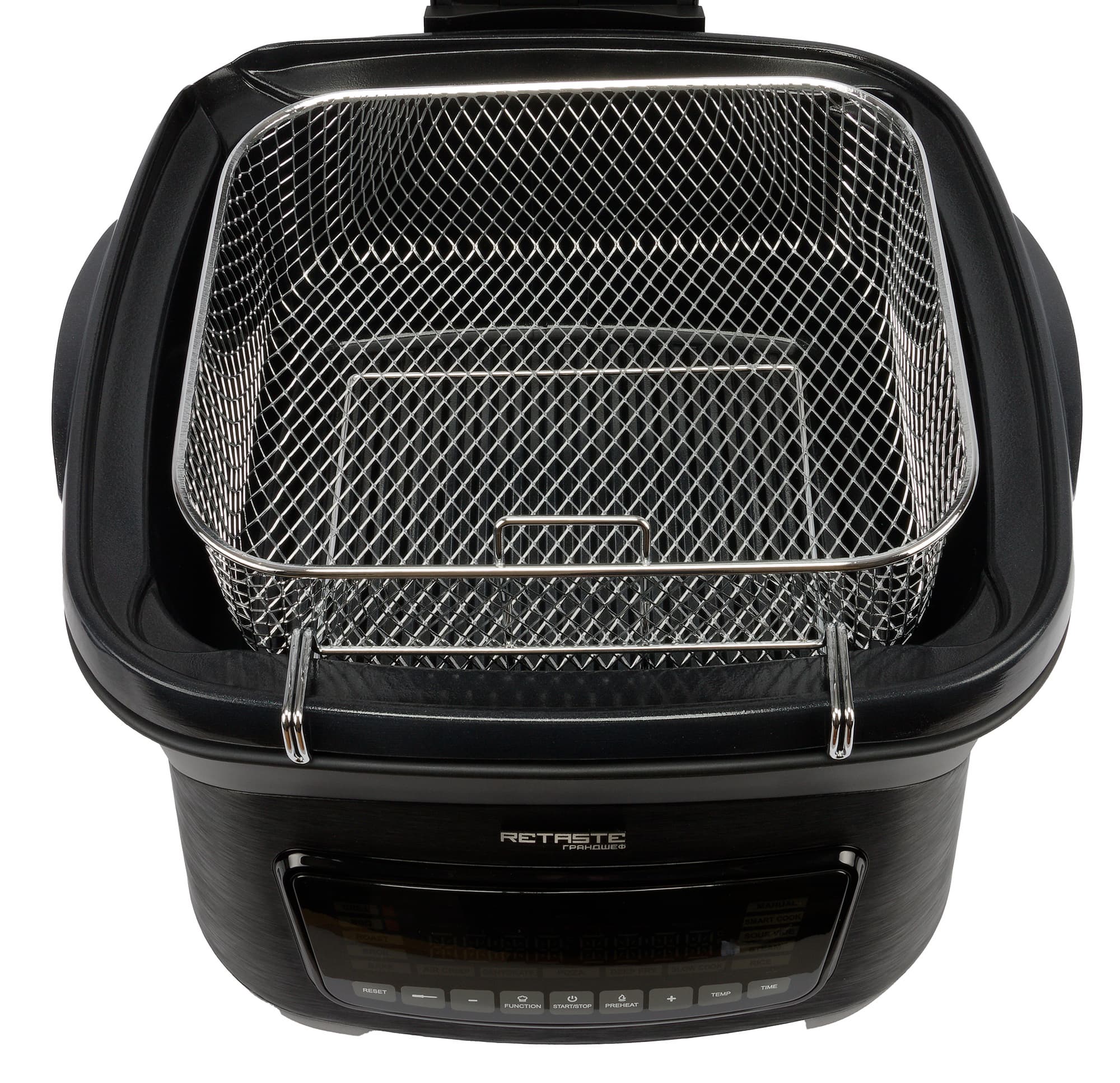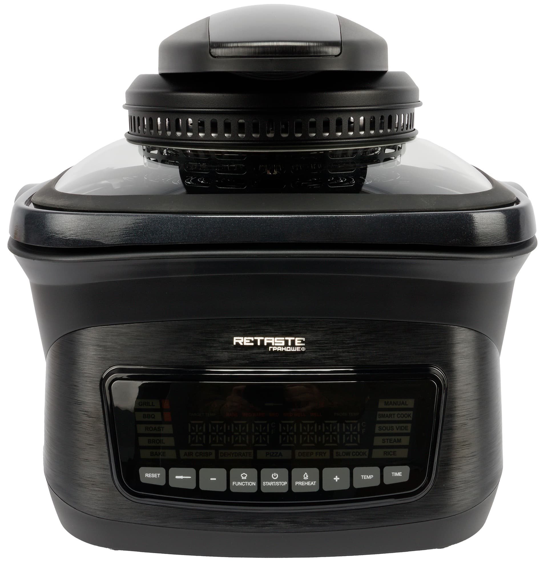 Аэрогриль ГрандШеф Retaste GRND-001, протестированный нами, способен заменить собой небольшую духовку, плиту, обычный гриль и мультиварку. Кроме корзины для фритюра, двух решеток и термощупа в комплектации прибора есть дополнительная стеклянная крышка, которой заменяется основная в некоторых режимах — например, тушения. Также в комплект входит большая тяжелая чаша с рифленым дном стойким керамическим антипригарным покрытием и полезным объемом 5 л.