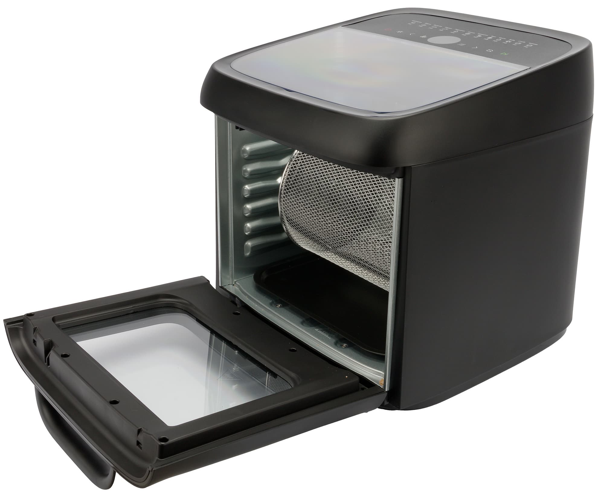 Вращение на вертеле или приготовление на шампурах обеспечивает равномерную прожарку крупных кусков мяса или птицы без необходимости их переворачивания. Вертел и шампуры можно встретить в комплектации продвинутых моделей, которые производители стараются сделать максимально универсальными, заменяющими множество кухонных приборов. В комплект могут включить и вращающуюся сетчатую корзину для приготовления картофеля-фри и овощей с хрустящей корочкой. Так, в комплектации аэрогриля Felfri FF-AF-08 мы нашли вертел, мини-шампуры, вращающуюся корзину и целый набор аксессуаров: противни, насадки, силиконовую форму и прихватку — не у каждой духовки такой богатый набор всяких полезных штуковин. Надо сказать, что этот прибор выглядит и открывается, как духовка, и выполняет большинство ее функций: на противнях можно готовить выпечку, на вертеле — целую курицу, и т. п. При таких возможностях есть и минус: камера маленькая, быстро и сильно пачкается жиром — например, при приготовлении крупных кусков мяса и птицы, и нуждается в постоянном тщательном уходе. Так что выбирая расширенную комплектация и, следовательно, функциональность, учитывайте и обратную сторону медали.