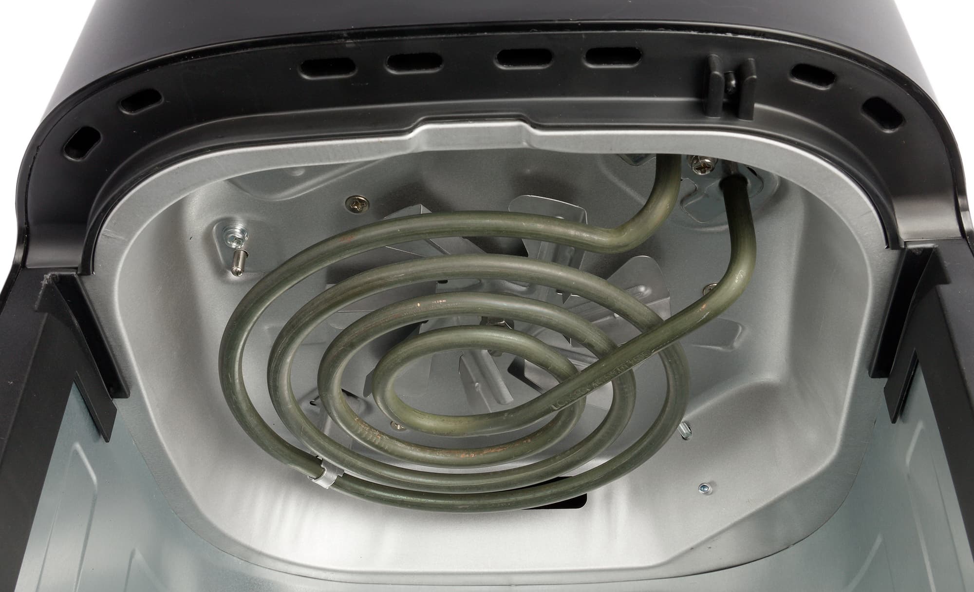 Как уже говорилось выше, объем камер у аэрогрилей маленький, и при приготовлении больших и жирных блюд — например, целой курицы, пачкается и внутренняя поверхность рабочей камеры, и тэн. В некоторых моделях тэн защищен от брызг жира решеткой, как в Redmond AG1901.