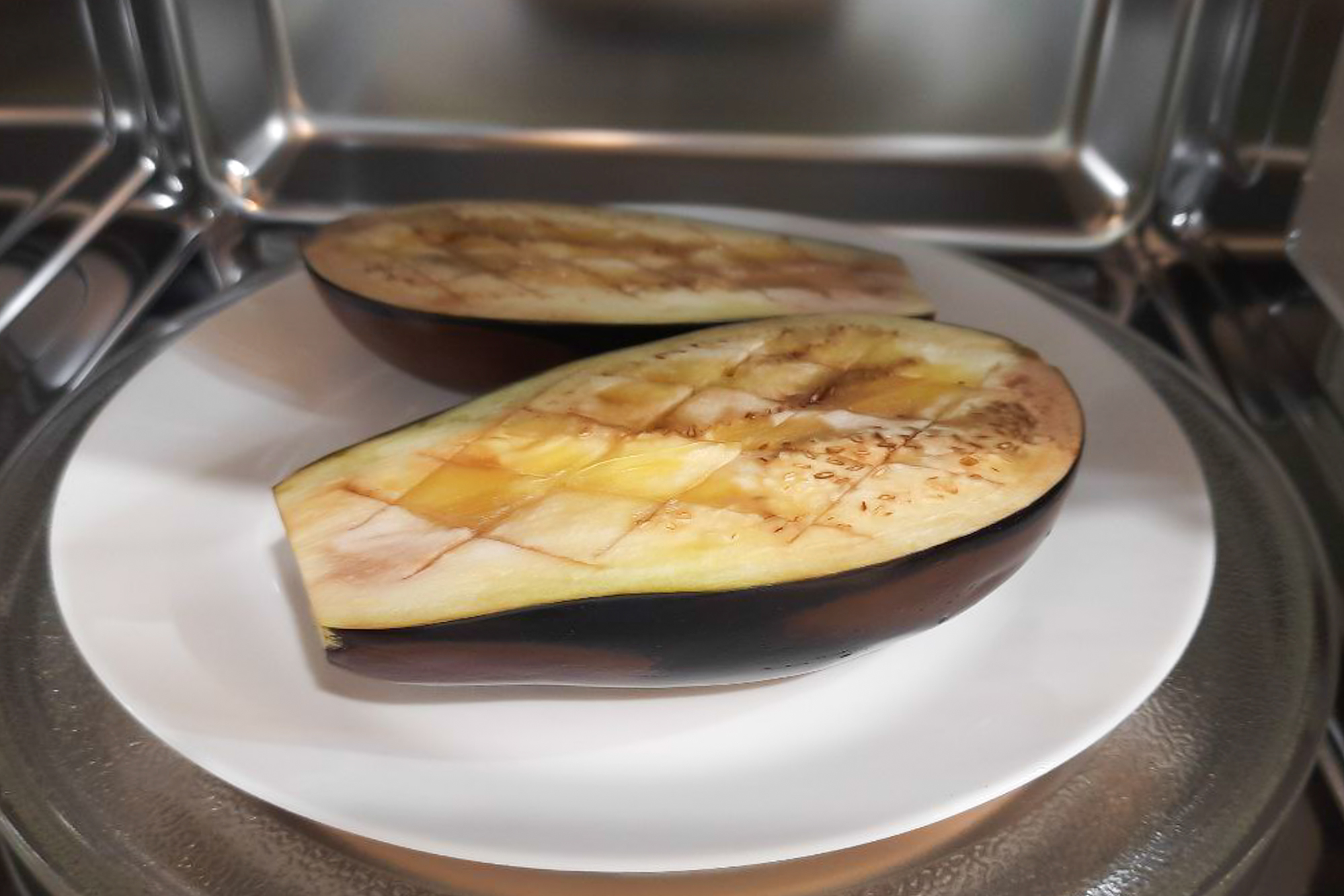 Во современных моделях СВЧ есть специальные режимы для овощей, но эти режимы часто немного недоработаны, и приходится самостоятельно додумывать, как сделать блюдо вкусным, и корректировать время и алгоритм приготовления. Мы готовили по такой программе во встраиваемой микроволновой печи History MIH 38SG MBK крупный баклажан. Разрезали его пополам, на каждой половинке сделали глубокие крестообразные надрезы, смазали маслом и присыпали солью. Микроволновку запустили в режиме «Овощи», выбрав вес продукта 400 г. Печь сама выставила 5 минут 30 секунд.