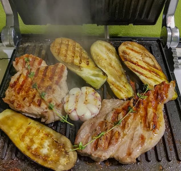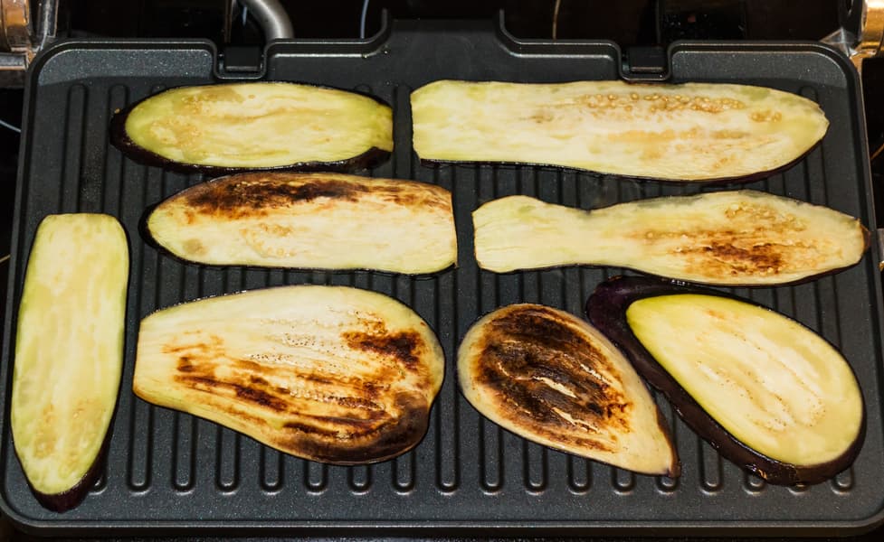 Баклажаны идеально готовятся в контактном гриле, когда одну пластину накрывают другой. Есть нюанс: если готовить синенькие одновременно с жирным мясом, то они впитают в себя очень много жира, который вытапливается из мяса. Получается, как мы убедились во время тестирования электрогриля Polaris PGP 1902, очень вкусно, но пользу оценят только приверженцы кето-диеты.