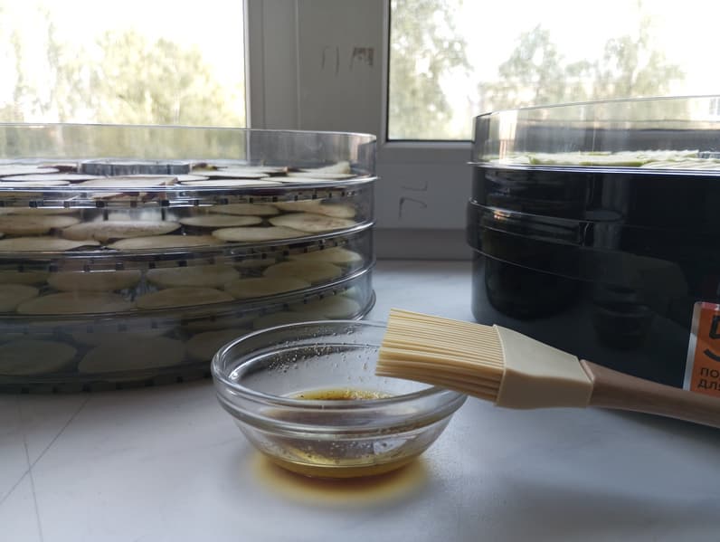 В таком приборе мы готовили чипсы из овощей, но вообще баклажаны на юге сушат и запасают примерно так же, как грибы в средних широтах. Тонкие сушеные слайсы из баклажанов приготовить несложно: баклажаны споласкиваем, по желанию очищаем от кожицы (мы не стали), шинкуем и выкладываем на поддоны.