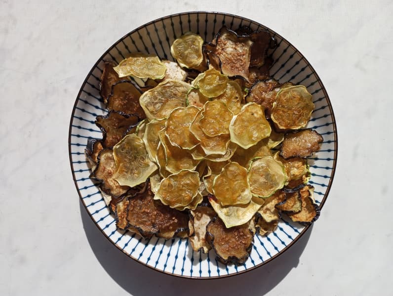 Производитель сушилки Redmond FD1100 рекомендует промариновать будущие чипсы, для чего нашинкованные овощи заливают маринадом из масла с соевым соусом и приправами. Мы же просто смазали слайсы кисточкой той же смесью, выбрали температуру 55 °C и установили таймер на 8 часов. Мы забыли переставить поддоны местами, поэтому пришлось увеличить время на пару часов. В итоге получились ломкие и очень вкусные снеки, у которых один недостаток: улетают моментально.