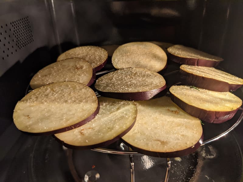 Если же использовать режим СВЧ+гриль, реализуемый во многих современных приборах, то сверху на овощах появится ароматная корочка — но лишь в том случае, если их хотя бы сбрызнуть, а лучше смазать растительным маслом, иначе они могут пересушиться. То же самое касается режима конвекции в СВЧ: сильный нагрев и обдув способны испортить баклажаны. Мы готовили баклажаны в таком режиме, тестируя микроволновую печь Redmond RM-2301D с керамическим грилем. Выбрали рецепт печеных баклажанов с помидорами и сыром: нарезали овощ поперек, разложили кружочки на решетку для гриля и включили комбинированный режим С2, который распределяет мощность микроволн и гриля в соотношении 36/64. Баклажаны приготовились до мягкости за десять минут, а потом мы разложили на каждом кусочке по ломтику помидора, добавили чеснока, пряностей и зелени, получившиеся «бутерброды» накрыли кусочками сыра и запекали всё еще три минуты, чтобы расплавился сыр.