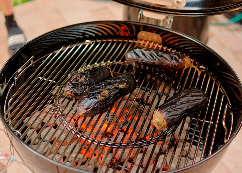 Баклажаны на гриле — средиземноморская классика, и готовить такое блюдо можно и на электрогриле любого типа, и на угольном гриле, который используется на открытом воздухе (например, мы готовили баклажаны на гриле Weber Master-Touch GBS, а потом делали из них бабагануш).