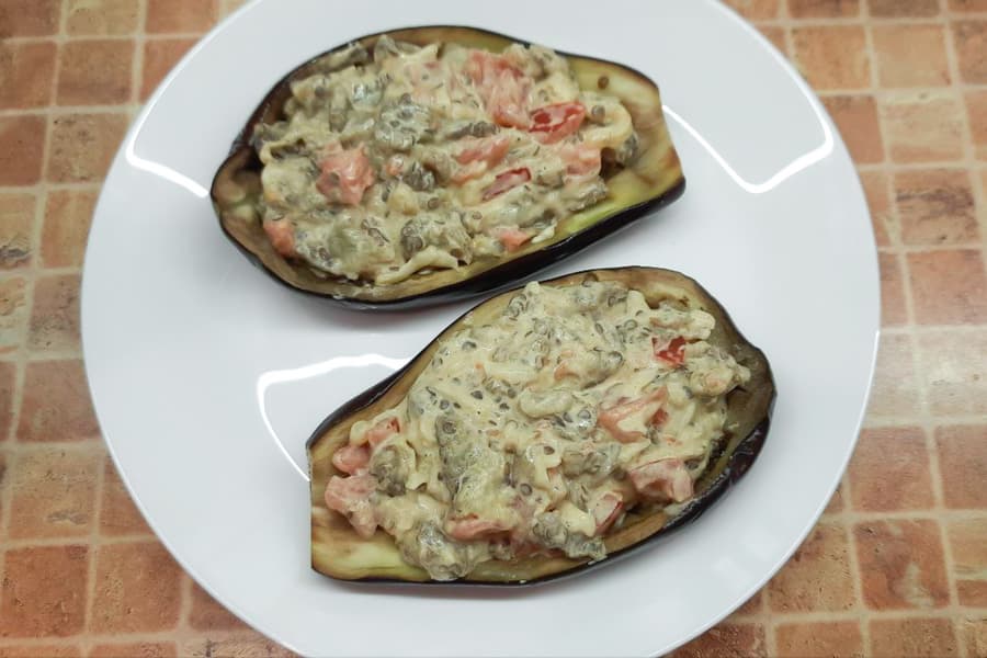 Мякоть за это время была готова, но шкурка — не до конца. Мы вынули из половинок мякоть, смешали ее с тертым сыром, измельченным чесноком, нарезанным кубиками томатом, сметаной и специями, выложили начинку в получившиеся лодочки из баклажанов, посыпали сверху тертым сыром и готовили еще три минуты, подняв в конце блюдо на решетку и включив на две минуты гриль.