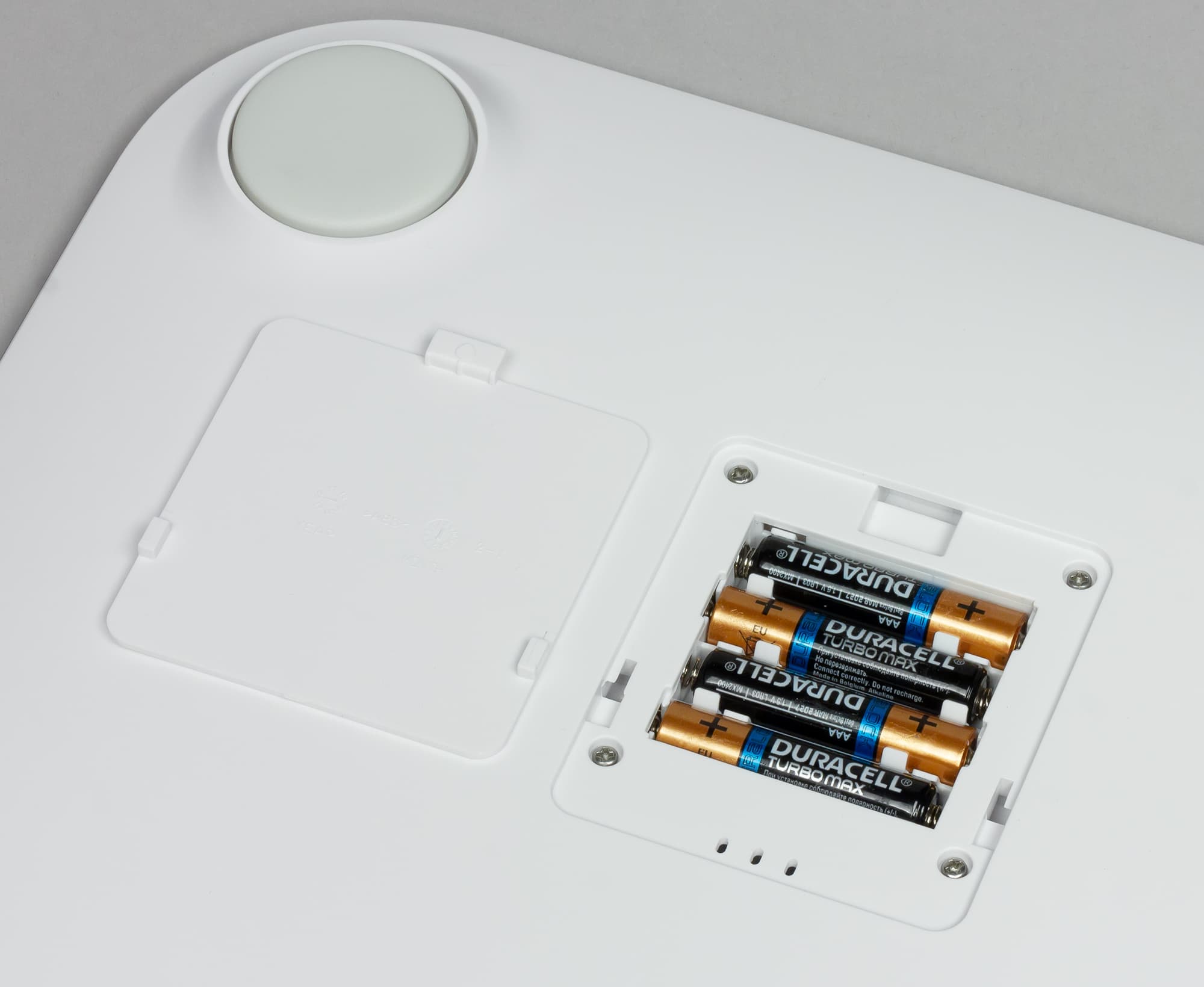 Как уже было отмечено, работают весы от четырех батареек AAA (мизинчиковых). Доступ к батарейному отсеку осуществляется просто и не требует использования никаких инструментов (отверток и т. п.). С такой же легкостью отсек и закрывается. Заметим, что для работы Runtastic Libra требуется только три батарейки, а не четыре. Но допускаем, что весы Huawei из-за этого проработают несколько дольше на одном комплекте.