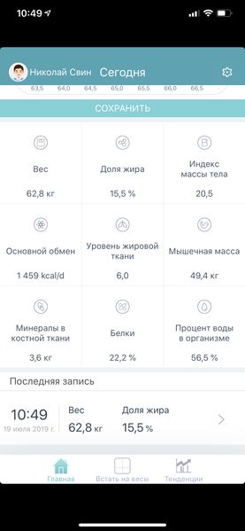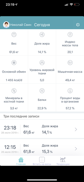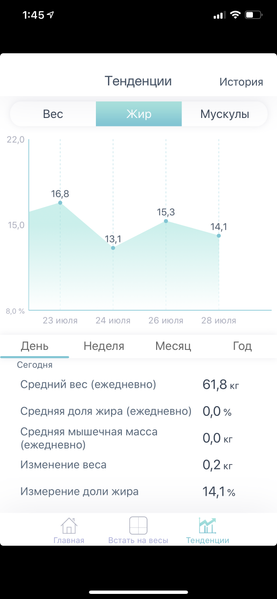 Для того чтобы сделать новое измерение, надо нажать на иконку «Встать на весы». Ну а если вы хотите в наглядной форме увидеть ваш прогресс — нажмите на «Тенденции». Причем данные можно посмотреть как по собственно весу, так и по жиру и мускулам.
