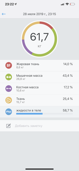 Итак, два главных параметра — вес и процент жира — обе модели определили почти одинаково. Разброс в 100 граммов — вполне допустимый. А вот мышечную массу они посчитали совершенно по-разному, причем доверия в данном случае больше к Runtastic. Не может мышечная масса составлять почти 5/6 от общей массы тела! Это явная ошибка.